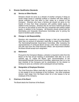 This document outlines the corporate governance guidelines for Computer Sciences Corporation. It addresses the role of the board of directors in overseeing management and acting in good faith. It also covers the composition of the board, including the size, selection process, and independence of directors. The document provides qualifications for directors, including limits on other board service and procedures for changes in job responsibilities. It describes board committees, conduct of meetings, access to management and advisors, performance evaluations, director compensation, orientation, education, and succession planning.