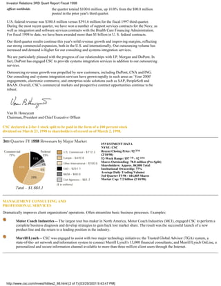 The document is a quarterly report from Computer Sciences Corporation (CSC) providing key financial information and highlights for investors. It summarizes that CSC's revenue increased 17.1% in the third quarter of fiscal year 1998 compared to the previous year. Net income also rose 20.5% over the same period. The report further outlines CSC's business segments and global operations, as well as new contracts and growth in key market sectors during the quarter.