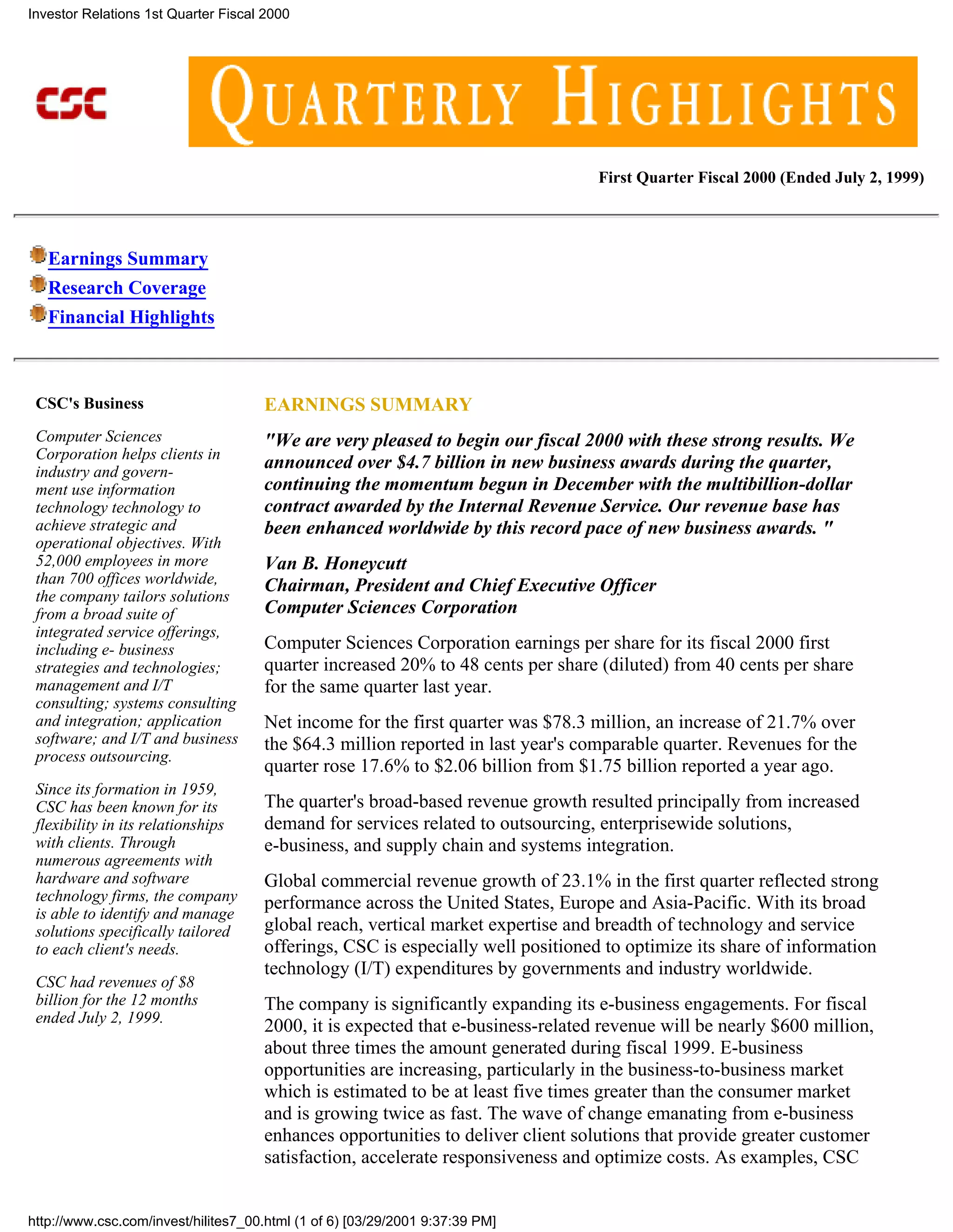 Computer Sciences Corporation (CSC) reported a 20% increase in earnings per share and a 21.7% increase in net income for the first quarter of fiscal year 2000 compared to the same quarter the previous year. Revenue increased 17.6% to $2.06 billion driven by increased demand for outsourcing, enterprise solutions, e-business, and systems integration. CSC also announced over $4.7 billion in new business awards during the quarter and expects e-business revenue to triple to nearly $600 million for the full fiscal year.