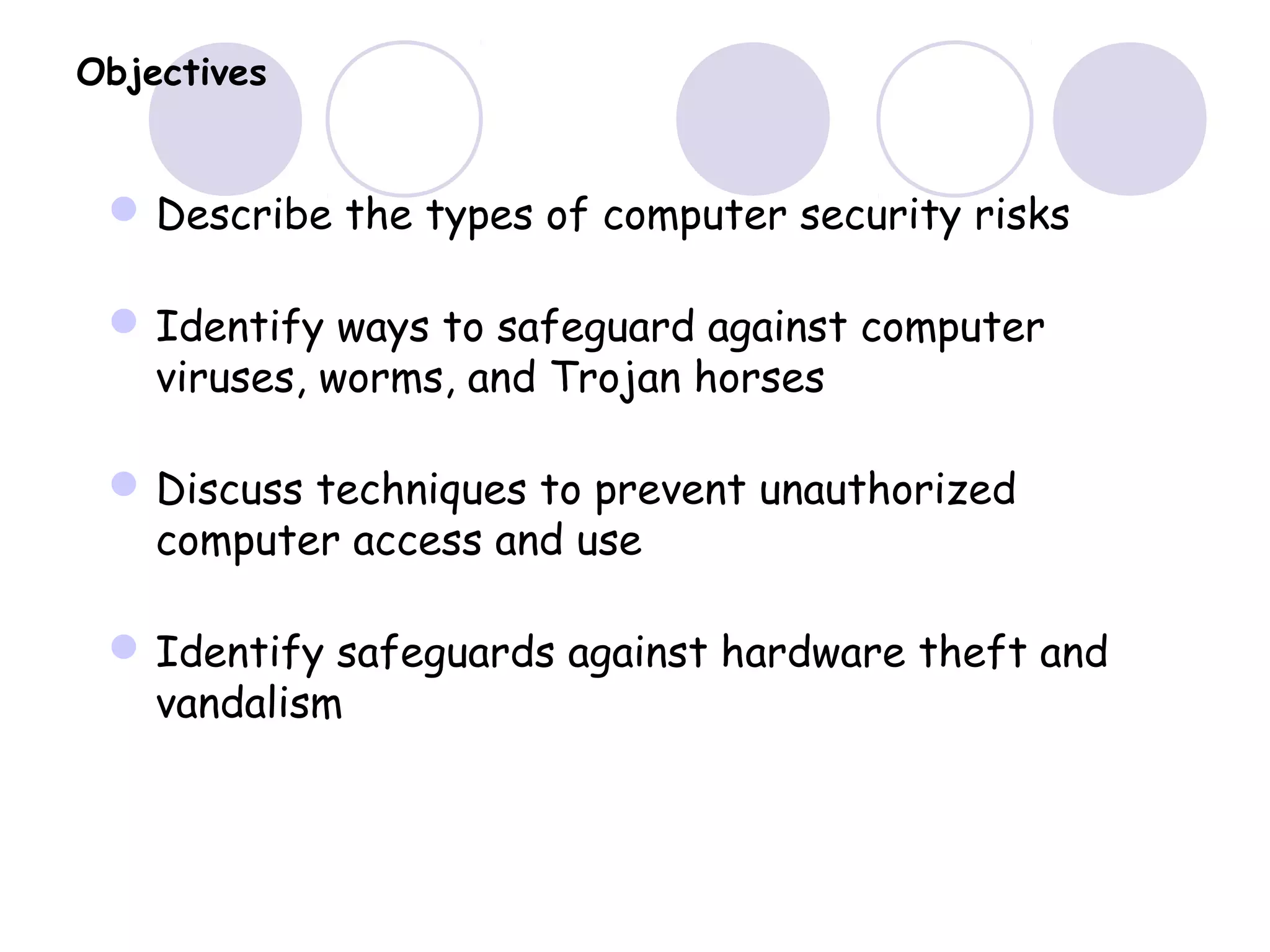 This document discusses computer security, privacy, and ethics. It covers types of security risks like viruses, unauthorized access, and hardware theft. It also discusses ways to protect against these risks, including installing antivirus software, using firewalls and passwords, backing up data, and encrypting sensitive information. The document also covers legal and ethical issues around topics like software piracy, privacy laws, and health concerns related to computer use.