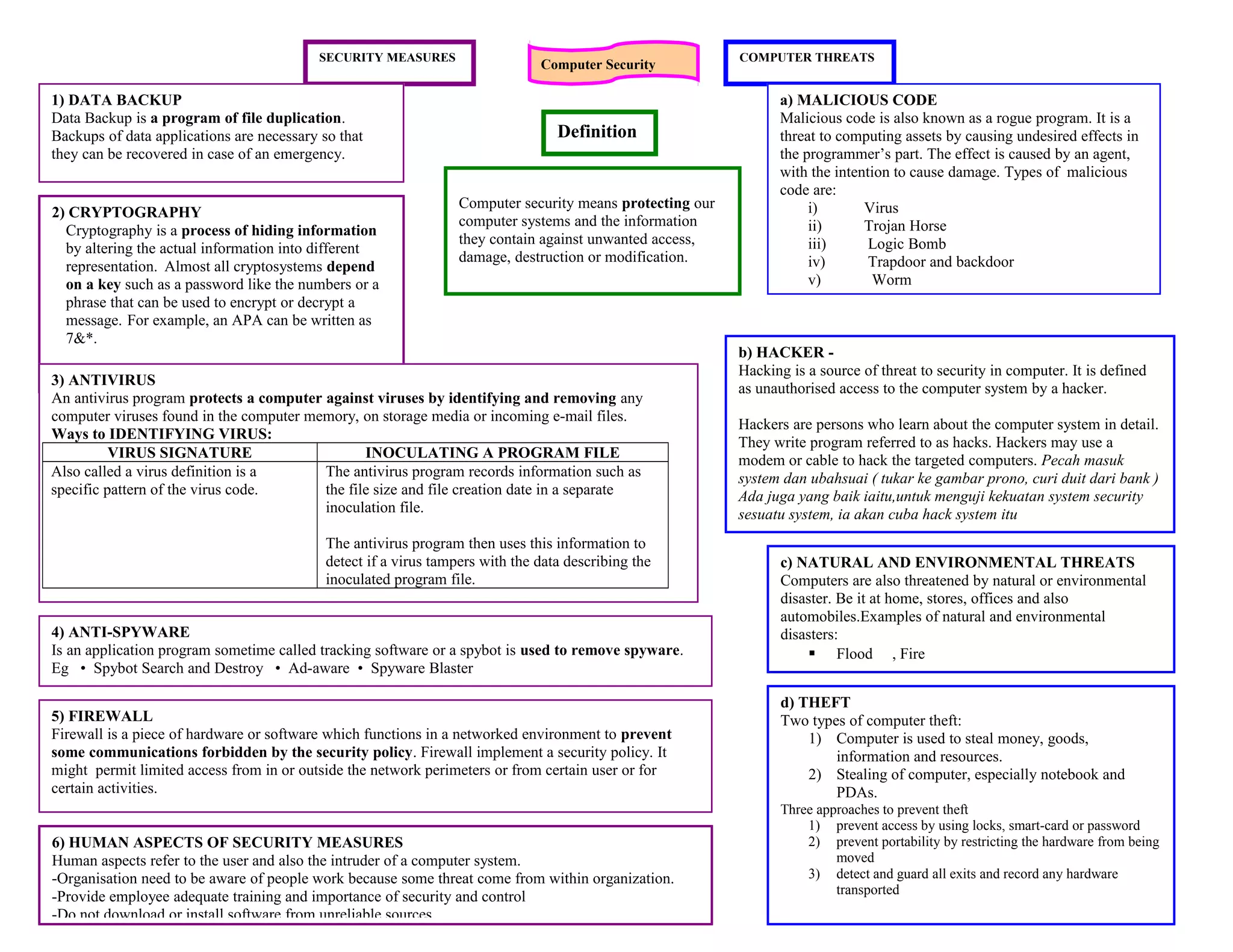 1) Ukuran keselamatan komputer seperti data backup, kriptografi, antivirus, anti-spyware dan firewall digunakan untuk melindungi sistem komputer dan maklumat daripada ancaman seperti virus, hacker, dan kecurian.
