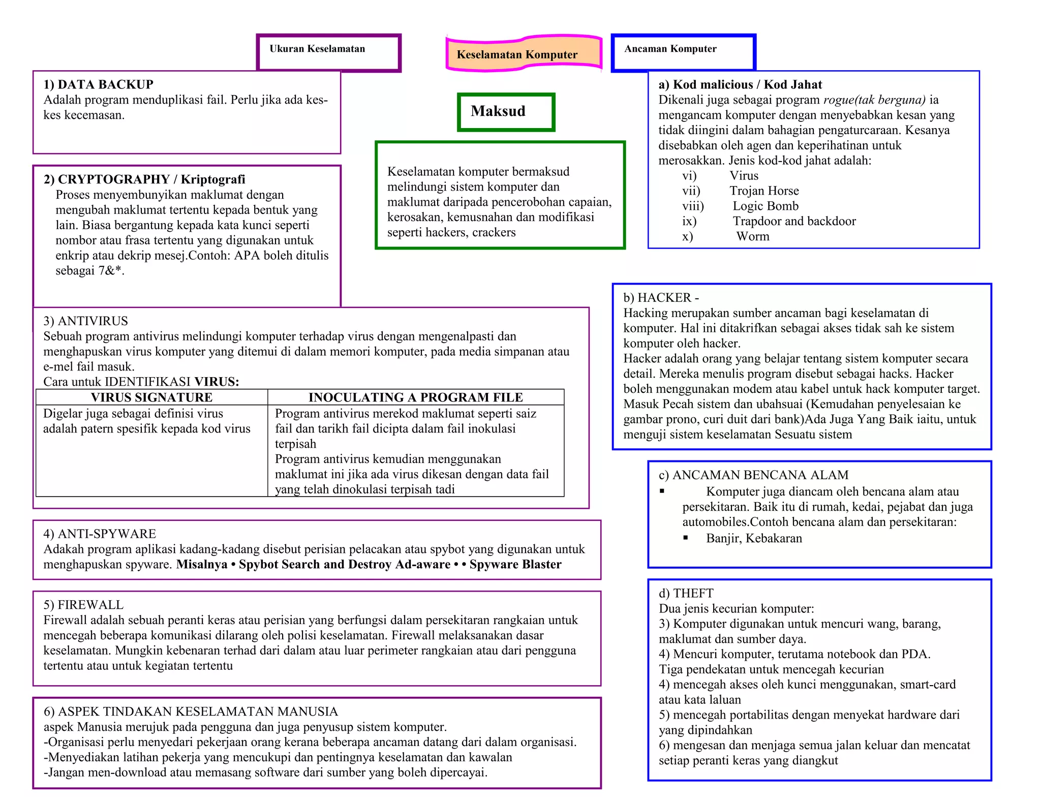 2) Ancaman komputer termasuk kod jahat, hacker, bencana alam, dan kecurian komputer atau maklumat. Langkah-langkah perlu diambil untuk menangani ancaman-ancaman ini.
