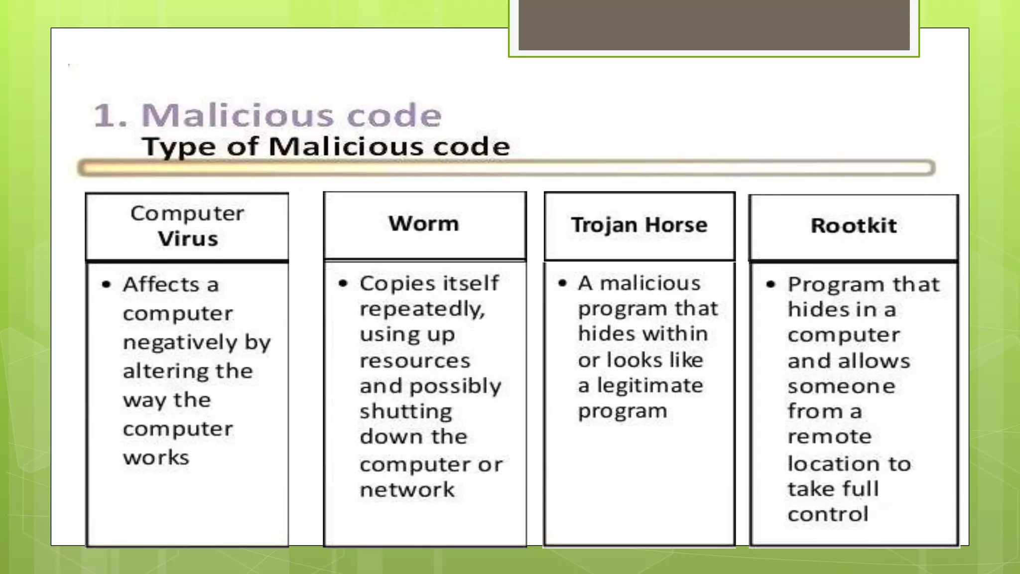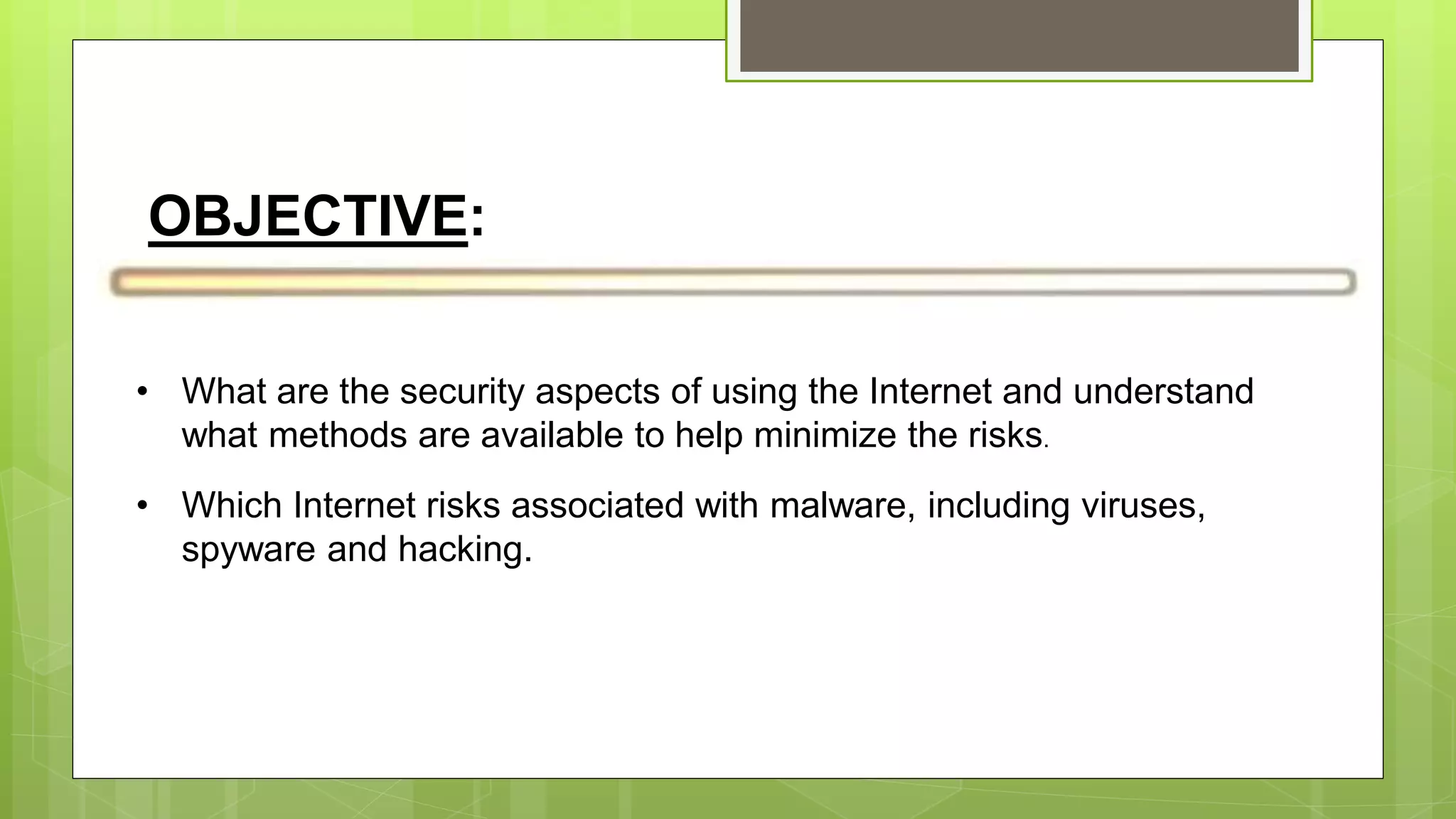 This document discusses various internet security risks such as malware, viruses, spyware, hacking, phishing, and pharming. It provides details on each risk, including how they work and potential security issues. Methods to minimize risks are discussed for most threats. For example, for viruses it notes they can be spread through email attachments and the importance of deleting suspicious emails. For phishing, it recommends verifying any unusual emails by contacting organizations directly rather than clicking links. Common sense and caution are emphasized as important protections against many internet security threats.