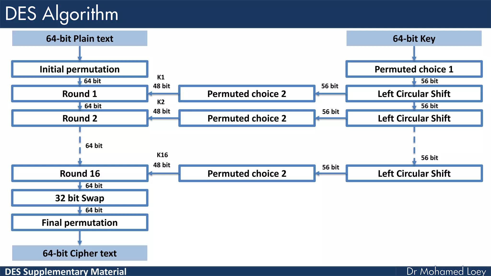 The document discusses the DES (Data Encryption Standard) encryption algorithm, detailing its processes including initial and final permutations, key shifts, and S-boxes. It provides a systematic breakdown of the encryption rounds and permutations involved, showing how plaintext is transformed into ciphertext using specific bit manipulations. Various tables and key schedules are included to illustrate the steps and components necessary for executing the algorithm.
