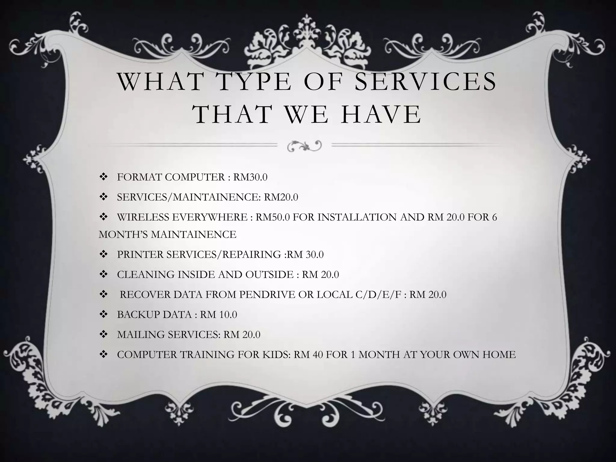 This document lists computer services and their prices offered by Md.Tarmizee, including formatting computers for RM30, wireless internet installation for RM50 plus RM20 monthly maintenance, printer services for RM30, data recovery from drives for RM20, backup services for RM10, and computer training for kids at home for RM40 per month. Contact information is provided as an email, phone number, address, and Facebook account to reach Md.Tarmizee for any of these computer services.
