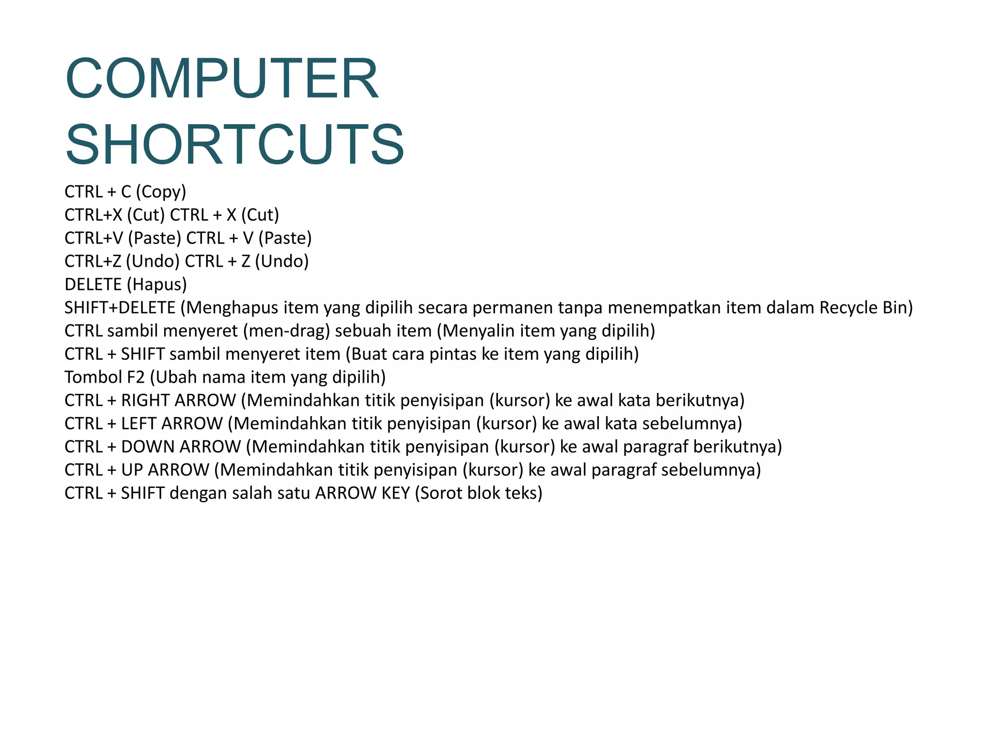 Dokumen tersebut memberikan ringkasan singkat tentang berbagai pintasan keyboard untuk berbagai aplikasi seperti Microsoft Windows, Microsoft Office, Internet Explorer dan lainnya. Beberapa pintasan keyboard utama adalah CTRL+C untuk menyalin, CTRL+V untuk menempel, CTRL+Z untuk membatalkan, dan ALT+TAB untuk beralih antar aplikasi.