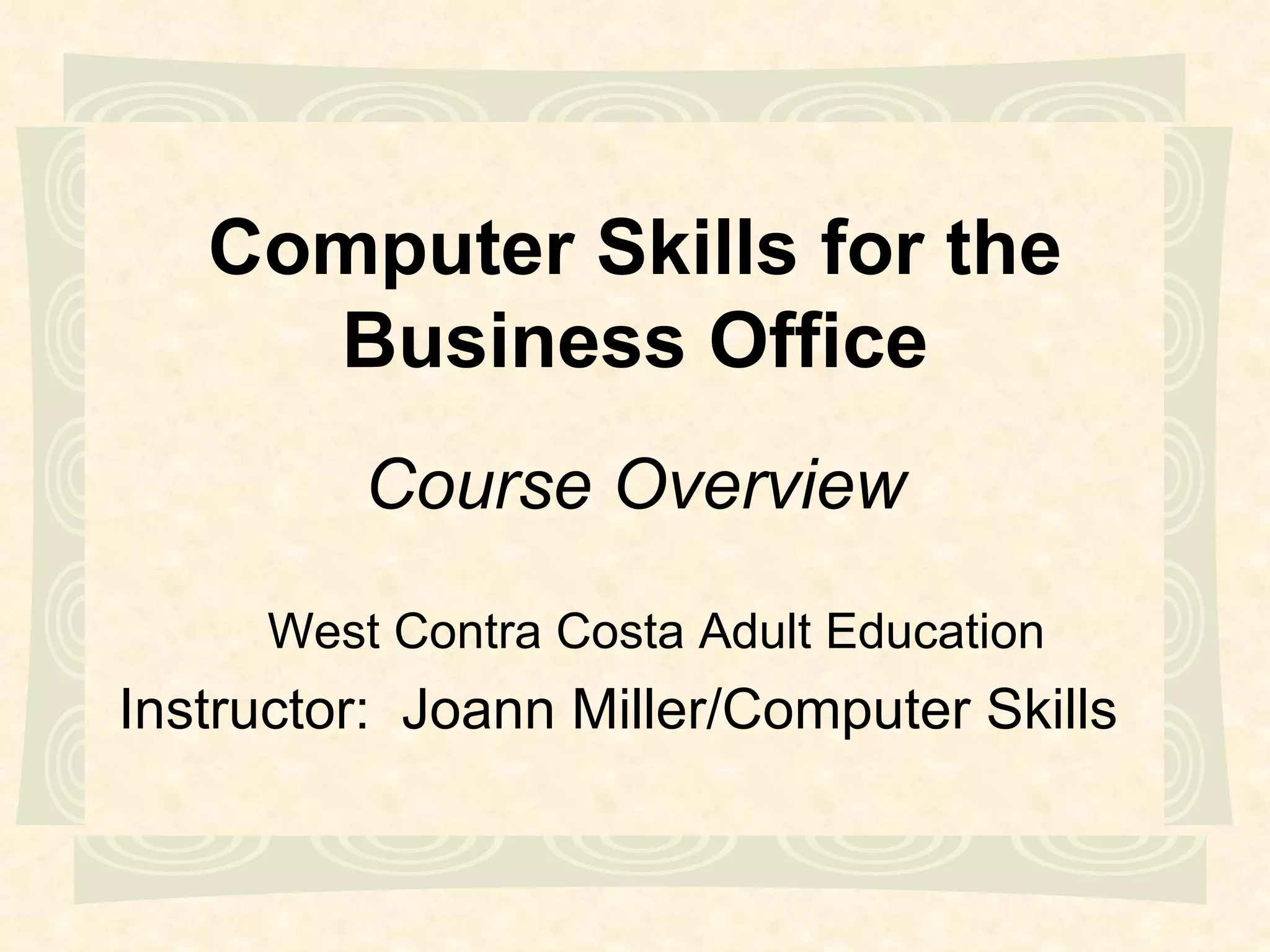 This six-week computer skills course taught by Joann Miller at West Contra Costa Adult Education aims to develop proficiency in Microsoft Office applications such as Word, Excel, PowerPoint, and Outlook. The daily format includes typing exercises, lectures, hands-on practice assignments, and weekly typing tests. Students must maintain at least a 90% attendance rate, type 40 words per minute with 90% accuracy, and complete 90% of assignments with minimal errors to receive a certificate of completion and skills sheet documenting their proficiency at the end of the course.