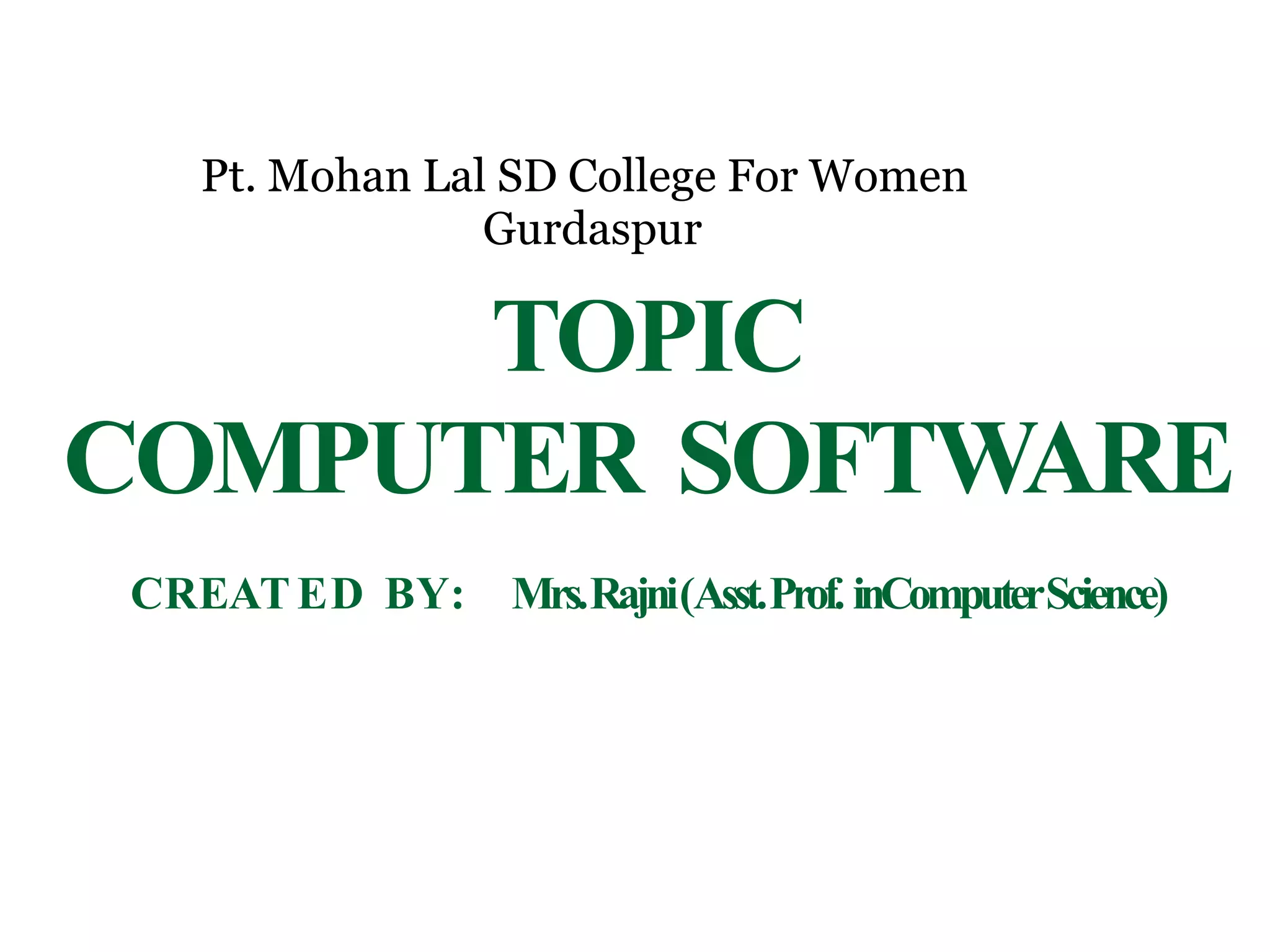 The document discusses different types of computer software. It defines software as a set of instructions that can perform tasks. There are two main types of software: system software and application software. System software includes operating systems, utilities, device drivers, and language translators. It controls hardware and allows application software to run. Application software includes programs like word processors and spreadsheets that do useful work for users. The document provides examples and descriptions of different categories of both system and application software.