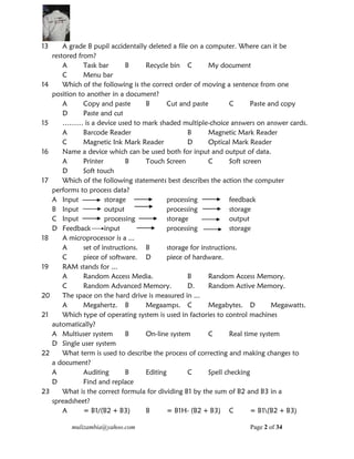 The document provides a list of 60 multiple choice questions related to computers and technology. It covers topics like hardware, software, file management, networks, spreadsheets, and other common computer terms and applications. The questions are intended to test knowledge of basic computer literacy and functionality.