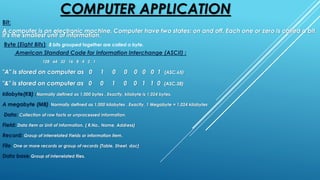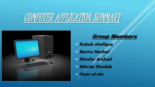The document provides information about five group members working on a computer applications project. It then discusses various topics related to computers including bits, bytes, ASCII, file storage units, computer hardware components, input/output devices, storage devices, network topologies, and cable media types.