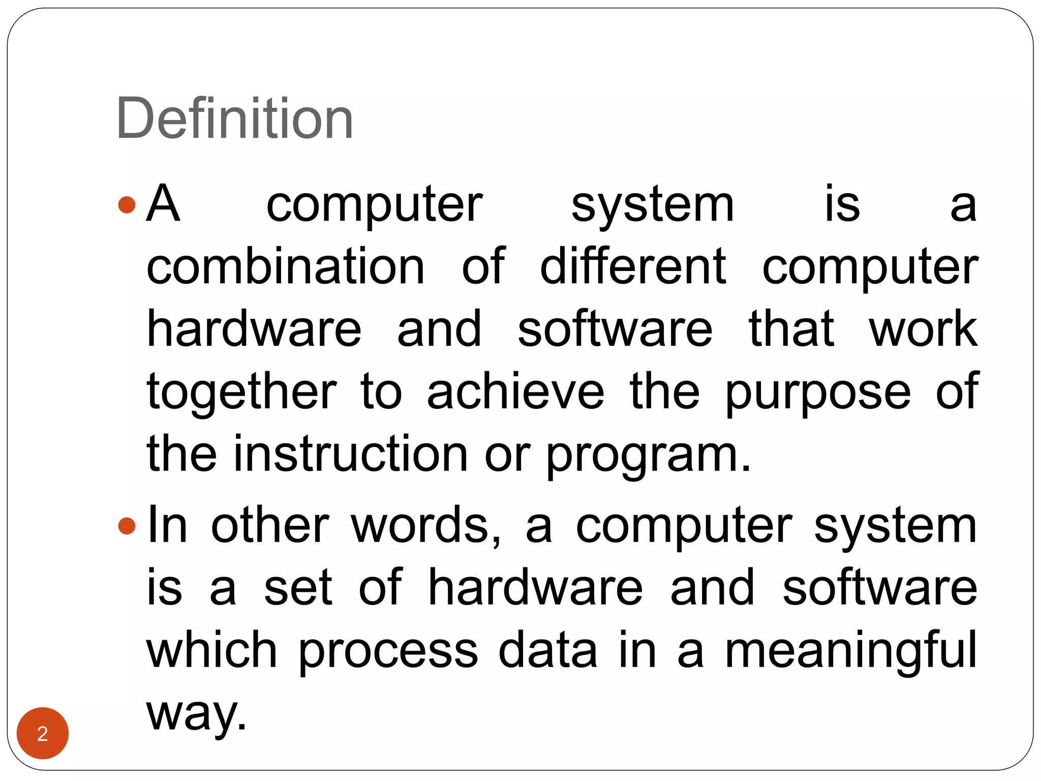 This document defines and describes the components of a computer system. It explains that a computer system consists of hardware and software that work together to process data as instructed by a program. The main components are the input unit, central processing unit (CPU), memory unit, arithmetic logic unit (ALU), control unit, secondary memory, and output unit. The CPU contains the ALU, control unit, and primary memory. The control unit coordinates data flow and signal processing. The document provides details on the functions of each component in processing and presenting data as instructed by the user.