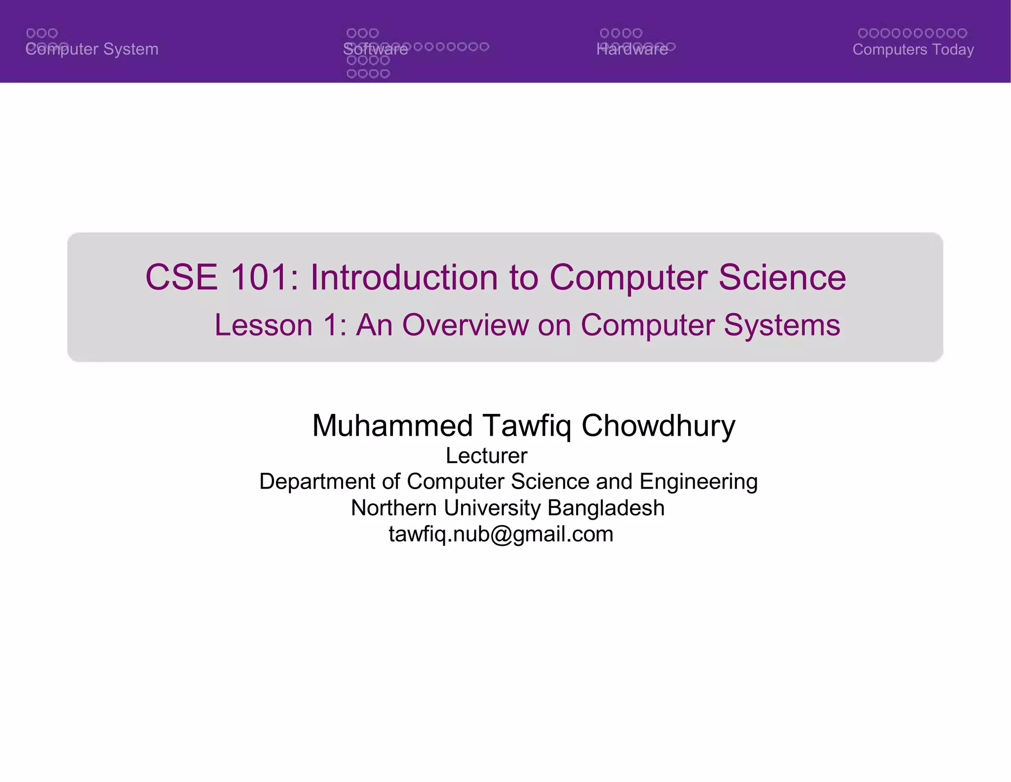 The document provides an overview of computer systems, including their key parts, software, operating systems, hardware, and classifications. It discusses how a computer system consists of software, hardware, data, and users. The main parts are software, which includes operating systems and applications, and hardware, which are the physical components. Operating systems manage resources, tasks, security, and provide user interfaces and file management. Hardware processes and stores data. Computers today come in various classifications.