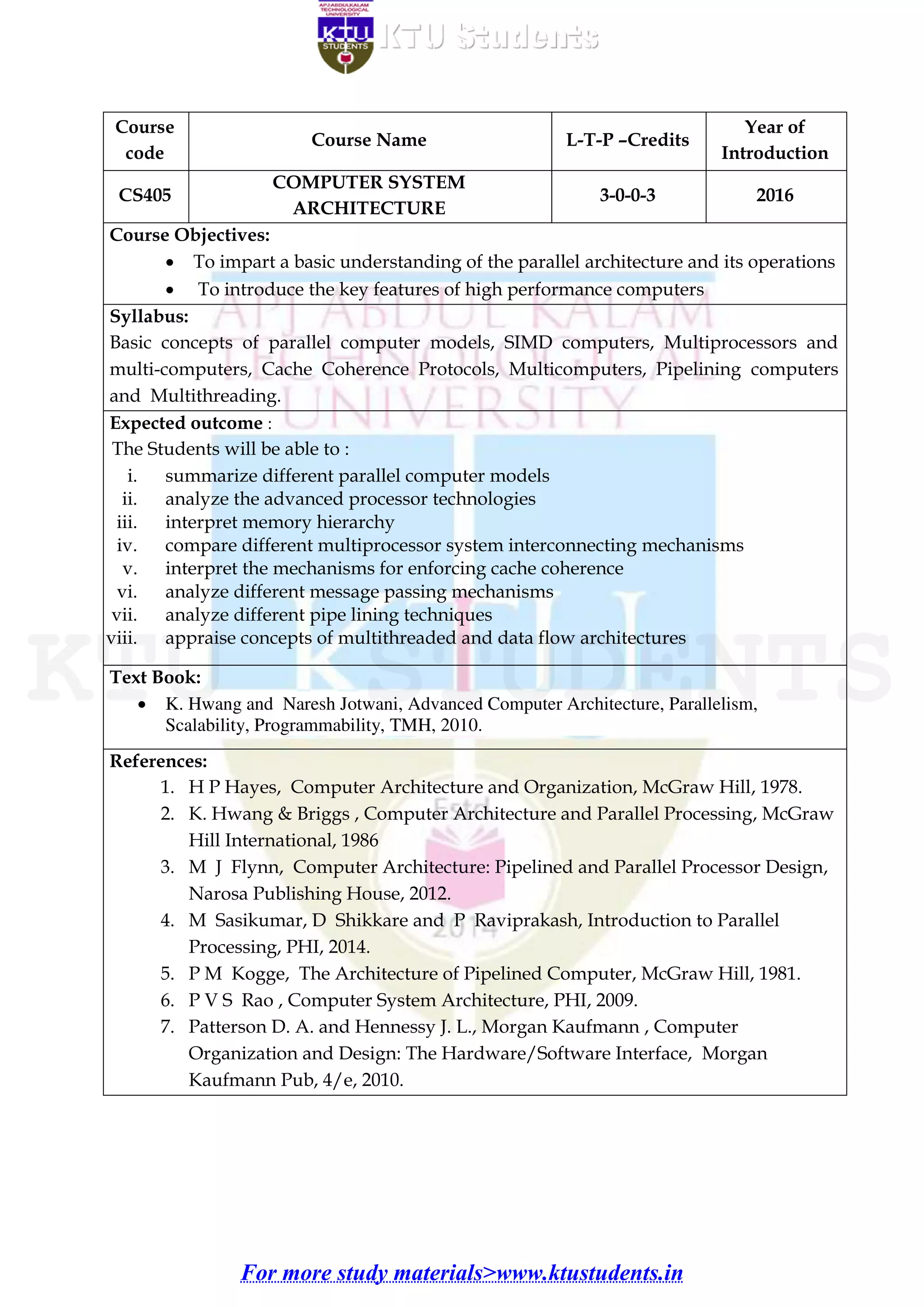 This document provides information about the course "Computer System Architecture". It is a 3 credit hour course introduced in 2016. The course aims to impart understanding of parallel architectures and high performance computers. The syllabus covers topics like parallel computer models, multiprocessors, cache coherence protocols, pipelining, and multithreading. The expected outcomes are that students will be able to summarize parallel models, analyze advanced processors and memory hierarchy, and appraise concepts of parallel architectures. The course is divided into 6 modules covering these topics, and assessed through internal exams, assignments, and an end semester exam.