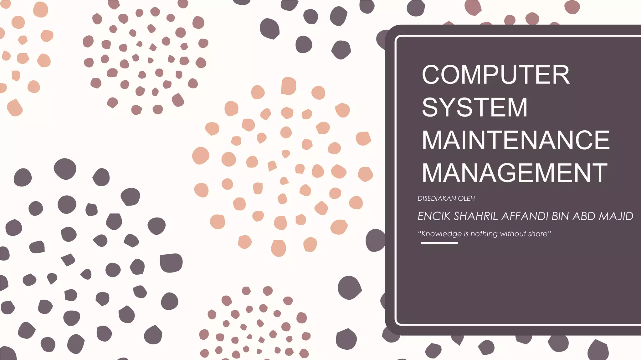 Dokumen ini membahas pengurusan penyelenggaraan sistem komputer, termasuk definisi, skop, dan jenis-jenis penyelenggaraan seperti penyenggaraan yang dirancang dan tidak dirancang. Terdapat juga analisis risiko, prosedur keselamatan, serta alat dan teknik yang diperlukan untuk mengelola dan memelihara sistem komputer dengan efektif. Selain itu, dokumen memberikan panduan untuk penulisan laporan dan penyampaian persembahan yang berkesan dalam konteks penyelenggaraan komputer.