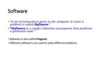 The document provides an overview of computer software, categorizing it into system software and application software, and describes their functions and examples. It details various types of operating systems, such as single-user, multi-user, multitasking, and real-time systems, and discusses their characteristics and usage. Additionally, it introduces Microsoft Office 2010 features and Google Workspace, emphasizing collaboration, file sharing, and security.