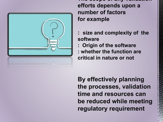 The document discusses computer system validation (CSV) in the pharmaceutical industry, outlining its definition, importance, and the requirements set by regulatory bodies such as the FDA. It explains the steps involved in CSV, including user needs assessment, design and functional specifications, testing phases, and documentation necessary for compliance. Furthermore, it highlights the consequences of noncompliance and the critical role of CSV in maintaining the integrity and reliability of systems used in drug production and distribution.