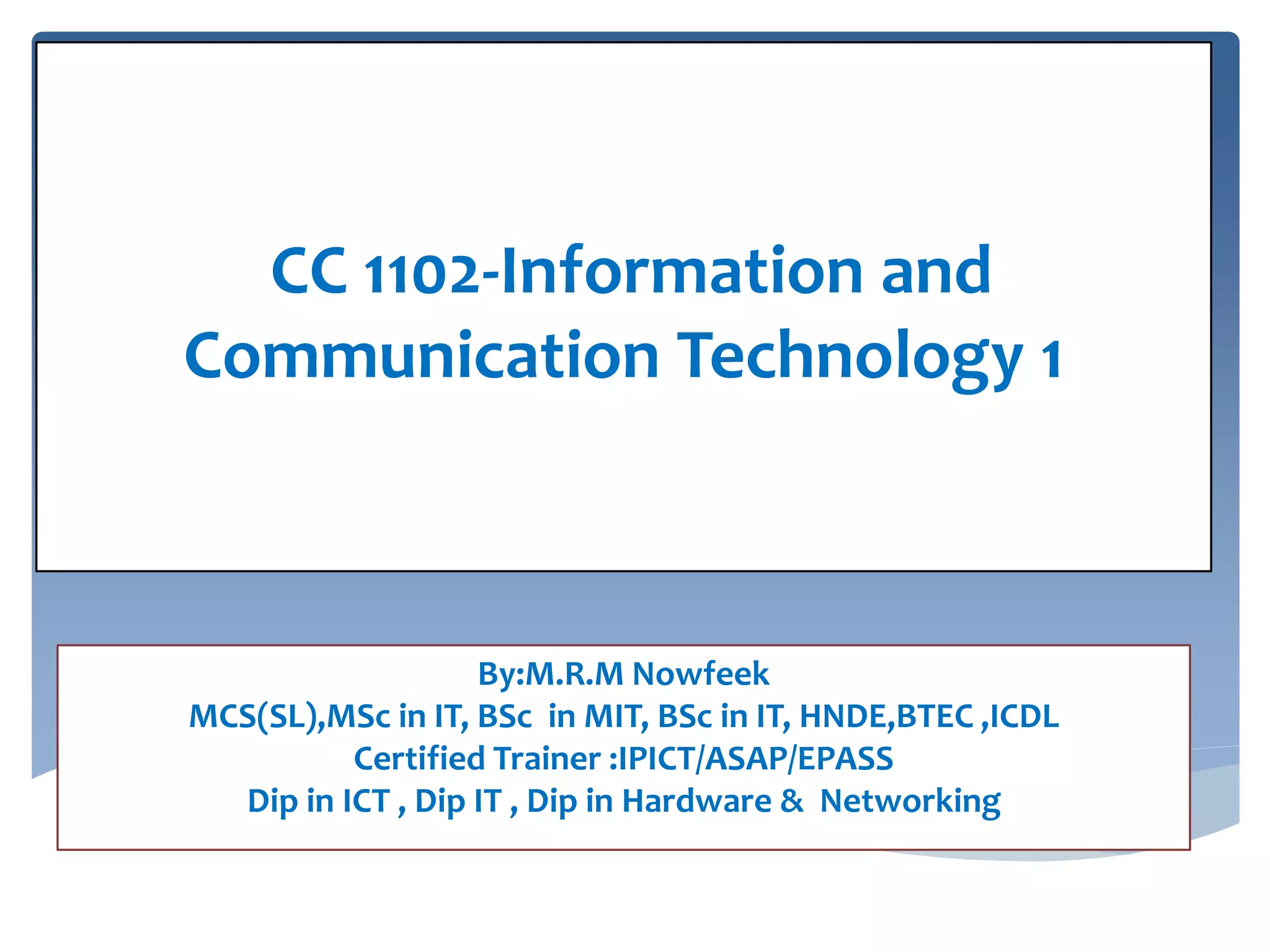 A computer is an electronic device that can accept data as input, process that data, and produce output based on those computations. It consists of interrelated hardware and software components that work together to convert data into information. The key components are the central processing unit (CPU), memory (RAM and ROM), and storage devices. RAM is volatile memory that temporarily stores data while the computer is on, while ROM is non-volatile and retains data even when powered off. Together, these components process input data according to stored instructions and produce useful output.