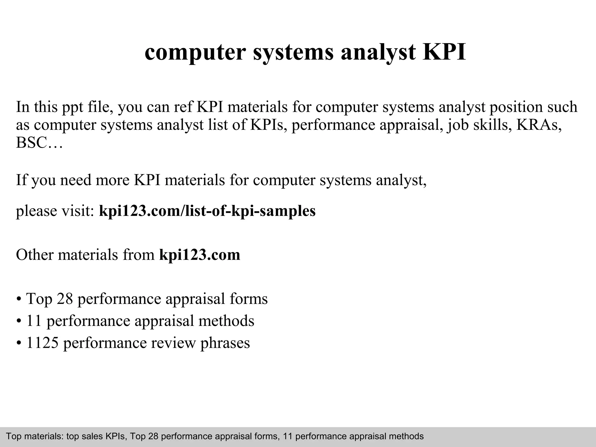 This document discusses key performance indicators (KPIs) for evaluating computer systems analysts. It provides steps for creating KPIs for this position, including defining objectives, identifying key result areas and tasks, and determining how to measure results. The document also lists types of KPIs and cautions against creating too many KPIs or ones that do not change to suit objectives. Additional KPI materials can be found on the listed website.