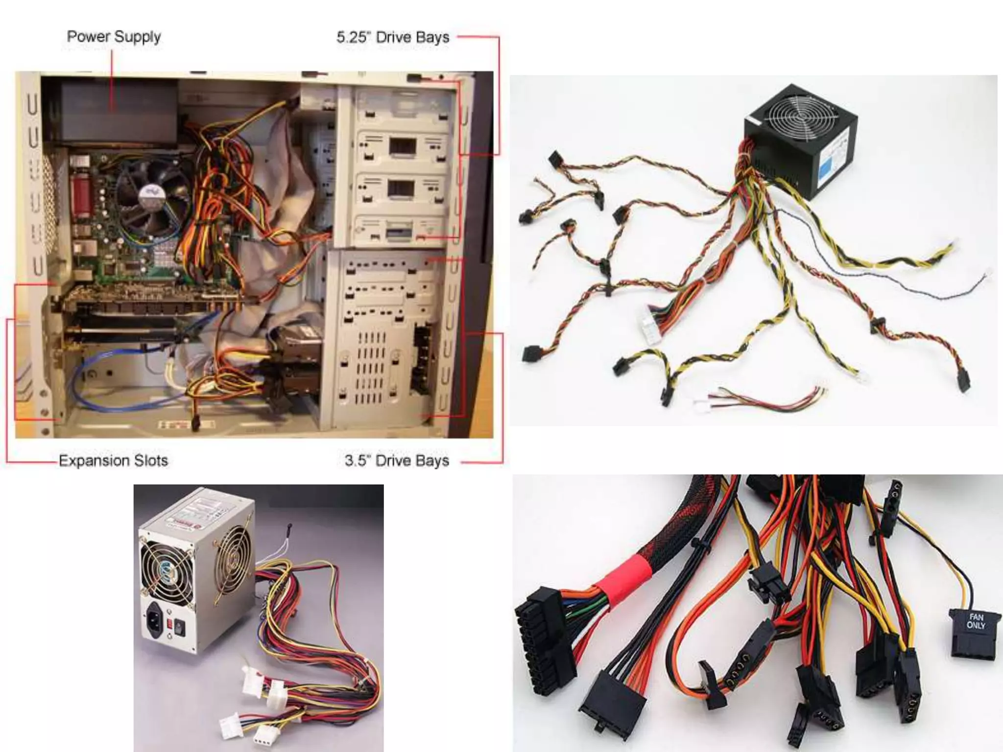 The document discusses the components and organization of a computer system unit. It describes how the system unit houses and protects components like the motherboard, power supply, expansion cards, and drives. There are two main types of chassis - tower and flatbed. A tower chassis resembles a tower with components screwed onto the right side panel and inputs/outputs on the rear. A flatbed chassis is more compact and saves space. The power supply converts mains power and provides different voltages to components via various connectors. Drive bays hold storage drives and buttons and LEDs on the front panel control and indicate power and HDD usage.
