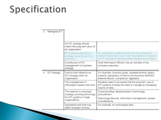 This document discusses ICT strategy development. It provides context on strategic plans and ICT strategies, and the purpose of a Chief Information Officer. Organisations must consider both internal and external factors when developing an ICT strategy. Internally, they should consider business goals, finances, legacy systems and information assets. Externally, key factors include technology changes, competitors, and compliance with various laws and regulations. The document provides examples of how these factors influence ICT strategy decisions.