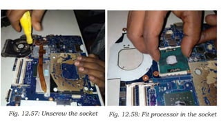 The document provides a detailed guide on the disassembly and assembly of a laptop, including specific steps for removing components such as the battery, hard drive, RAM, cooling fan, and motherboard. It emphasizes the importance of organizing screws and components throughout the process. The assembly section outlines the proper installation sequence for the processor, video card, memory, and finalizing the laptop's setup before powering on.