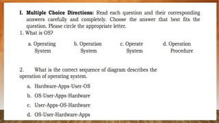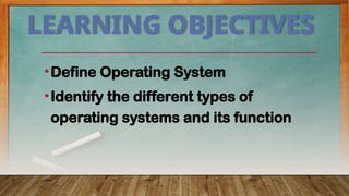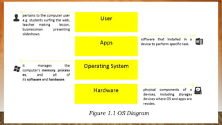 The document provides an overview of operating systems, defining them as software that allows users to run applications on computing devices while managing hardware resources. It categorizes operating systems into types such as Windows, Mac OS, Linux, and Remix OS, and explains various user interfaces including graphical and command-line interfaces. Additionally, it highlights mobile operating systems and poses questions for self-assessment on identifying different operating systems.