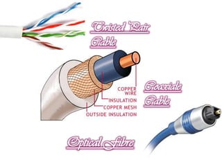 Network is a group of devices linked together to share data. A network breaks barriers of distance, cost and time, and is cost-effective. Networks transmit different types of data like text and audio. Networks use transmission media like guided media which uses cabling, and unguided media which doesn't use cabling. Common transmission media include twisted pair cable, coaxial cable, optical fiber, infrared, Bluetooth, Wi-Fi, microwave, radio waves, and satellites. Networks can be local area networks spanning a small area like an office, metropolitan area networks spanning a city, or wide area networks spanning countries. The Internet is a worldwide network that allows uses like accessing information and using communication tools.