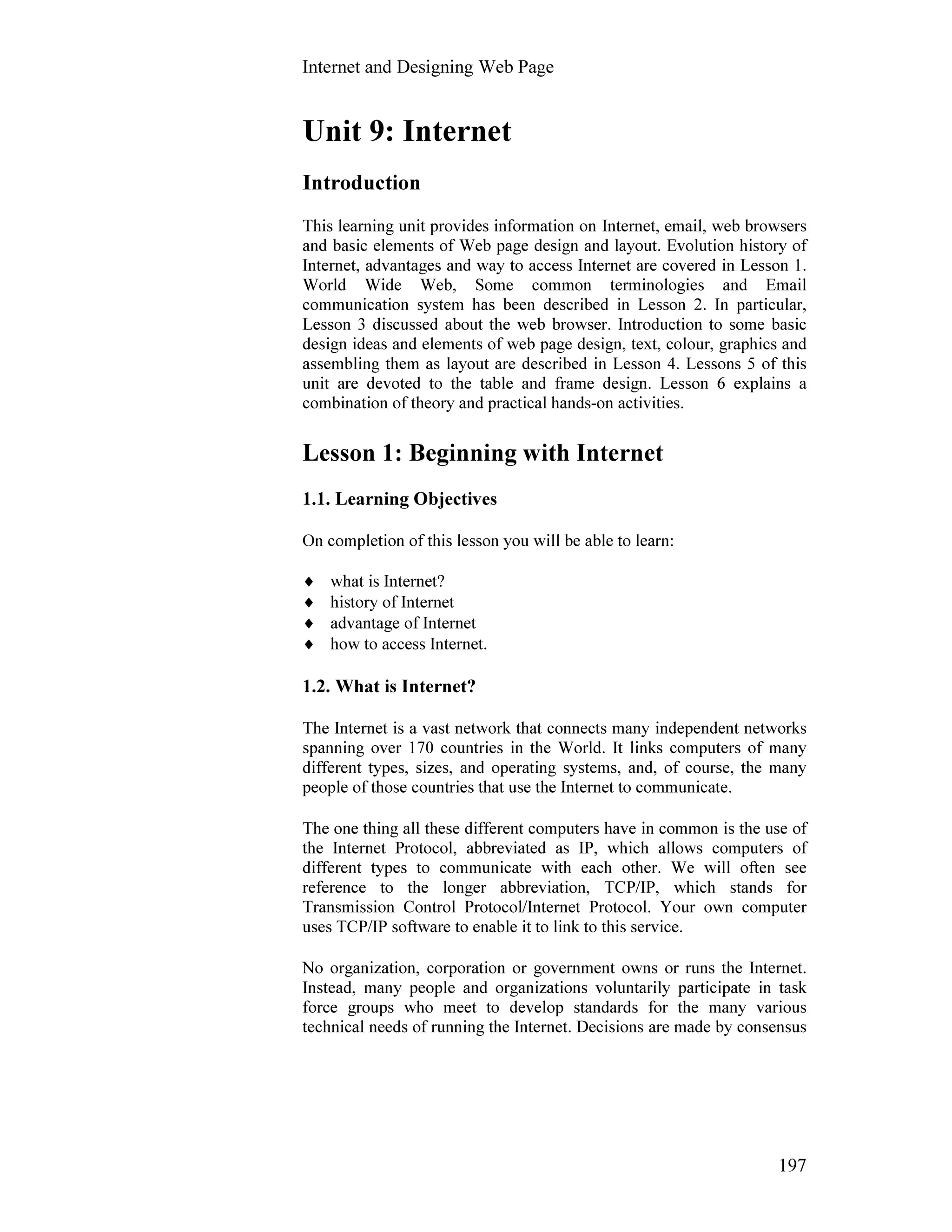 This document provides an overview of the Internet and designing web pages. It covers the history and evolution of the Internet from the 1960s to present. Key topics include what the Internet is, how it works using TCP/IP, its advantages for communication and information sharing, and common methods for accessing it like dial-up, DSL, WiFi and more. The document also explains basic elements of web page design including text, color, graphics and layout. It provides lessons on topics such as the World Wide Web, email, web browsers, and using tables and frames in web design.