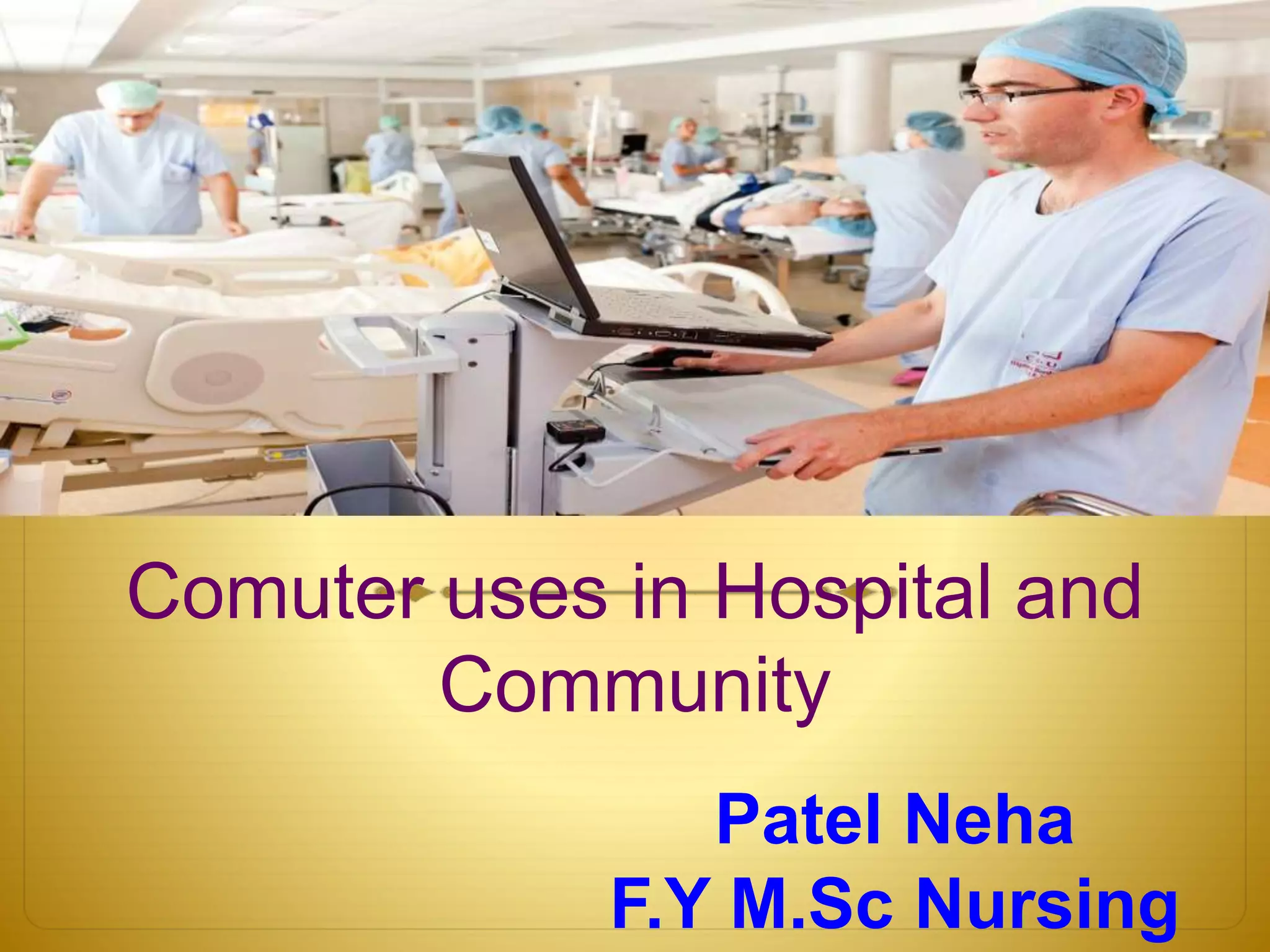 Computer uses in hospitals can provide numerous benefits such as improved quality of care, decreased costs, and advanced healthcare through electronic medical records, computerized learning and testing of nurses, and precise medical records, tests, and billing. Electronic health records integrate patient data, improve access to information, and support for clinical decision making and care coordination across settings. However, standards are needed for record synchronization and long-term storage of patient data.