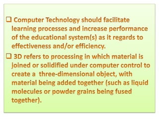 Computer technology is rapidly advancing and will transform how humans interact with machines over the next 20 years. Keyboards will become obsolete and be replaced by touchscreens, gesture recognition, speech recognition and other modes of more natural communication. Artificial intelligence capabilities will also increase dramatically through advances in machine learning and deep learning. Everyday technologies like vehicles may become fully autonomous. Nanobots, artificial human brains, flying taxis and pollution-free electric vehicles will start to emerge and change various aspects of life. Computer displays will move toward becoming flexible screens and even virtual or augmented reality glasses.