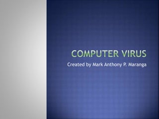 The document discusses computer viruses including what they are, why they are created, a brief history of viruses, types of viruses, and ways to prevent virus infections. It defines a computer virus as a program designed to harm infected computers. It then covers different types like macro, memory resident, overwrite, and direct action viruses. The document also discusses virus symptoms, notable viruses from the past, and recommends only downloading files from trusted sites and using antivirus software to prevent virus infections.