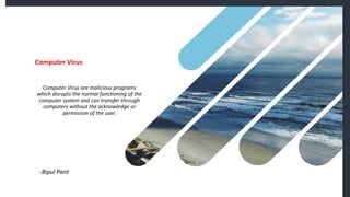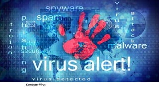 Computer viruses are malicious programs that can spread to computers without permission and disrupt normal functioning. They can corrupt files and make them unusable. It is important to have antivirus software installed like Avast or Kaspersky and to not open unknown or suspicious files. There are different types of viruses like boot sector viruses that infect startup areas and file infecting viruses that affect executable files. Always scan your computer if you receive suspicious files to check for and remove any viruses.