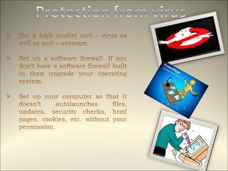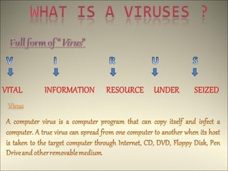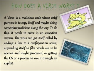 This document discusses computer viruses and malware. It defines different types of viruses like boot viruses, program viruses, polymorphic viruses, stealth viruses, and macro viruses. It also discusses worms, trojan horses, spam, and other types of malware. The document advocates for the potential use of "good viruses" that could help update antivirus software on networks rather than cause harm. It acknowledges the ongoing arms race between viruses and antivirus technology.