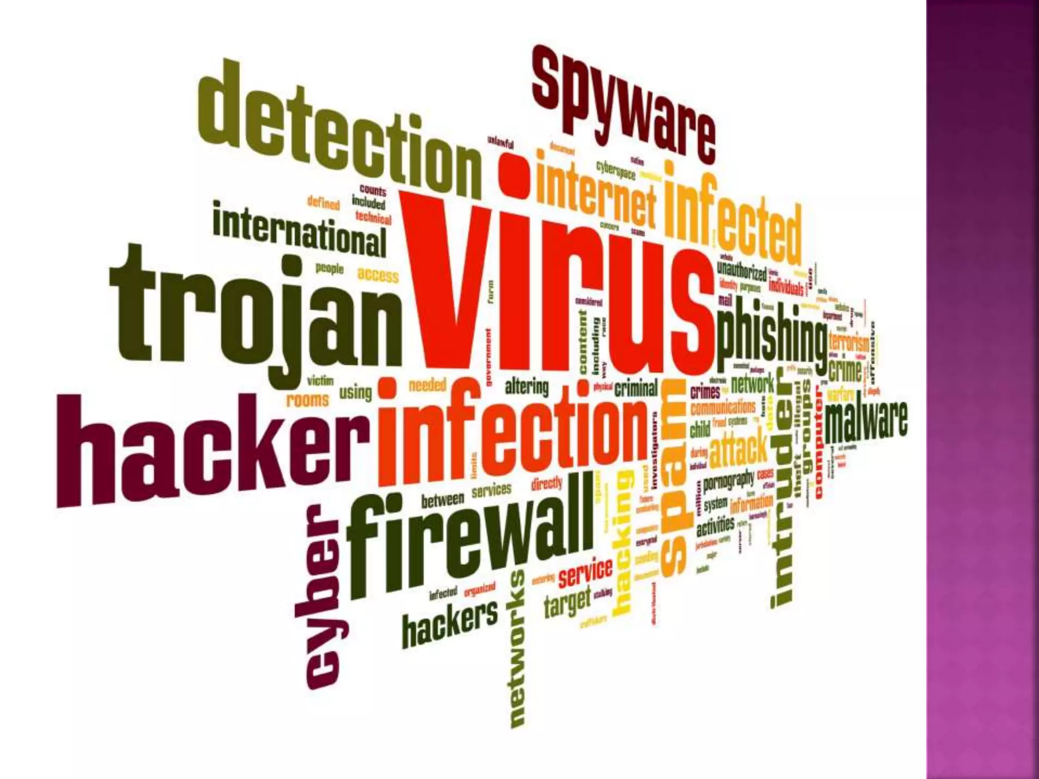 This document discusses computer viruses. It defines a virus as a program that infects and damages files. Viruses replicate by attaching themselves to other programs. They can be transmitted via email attachments, downloaded files, removable drives, or networks. Common symptoms of virus infection include computers running slowly, files changing or deleting unexpectedly, and error messages. The document recommends using antivirus software, scanning downloads, and avoiding suspicious websites or attachments to prevent virus infections. It describes two main types of viruses: boot sector viruses, which infect the boot sector and prevent computers from starting up, and file infecting viruses, which change the contents of files and replicate within files.