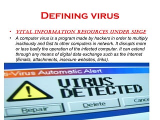 This document discusses different types of computer viruses and how to prevent and deal with viruses. It begins by defining what a computer virus is. It then describes 18 common types of viruses in detail, including resident, multipartite, direct action, overwrite, boot, macro, and polymorphic viruses. It also discusses worms, Trojans, and logic bombs. The document outlines general characteristics of viruses and how they can infect systems. It concludes by providing tips for preventing virus infections through antivirus software, replacing infected files, restarting from healthy disks, and reformatting disks if needed.