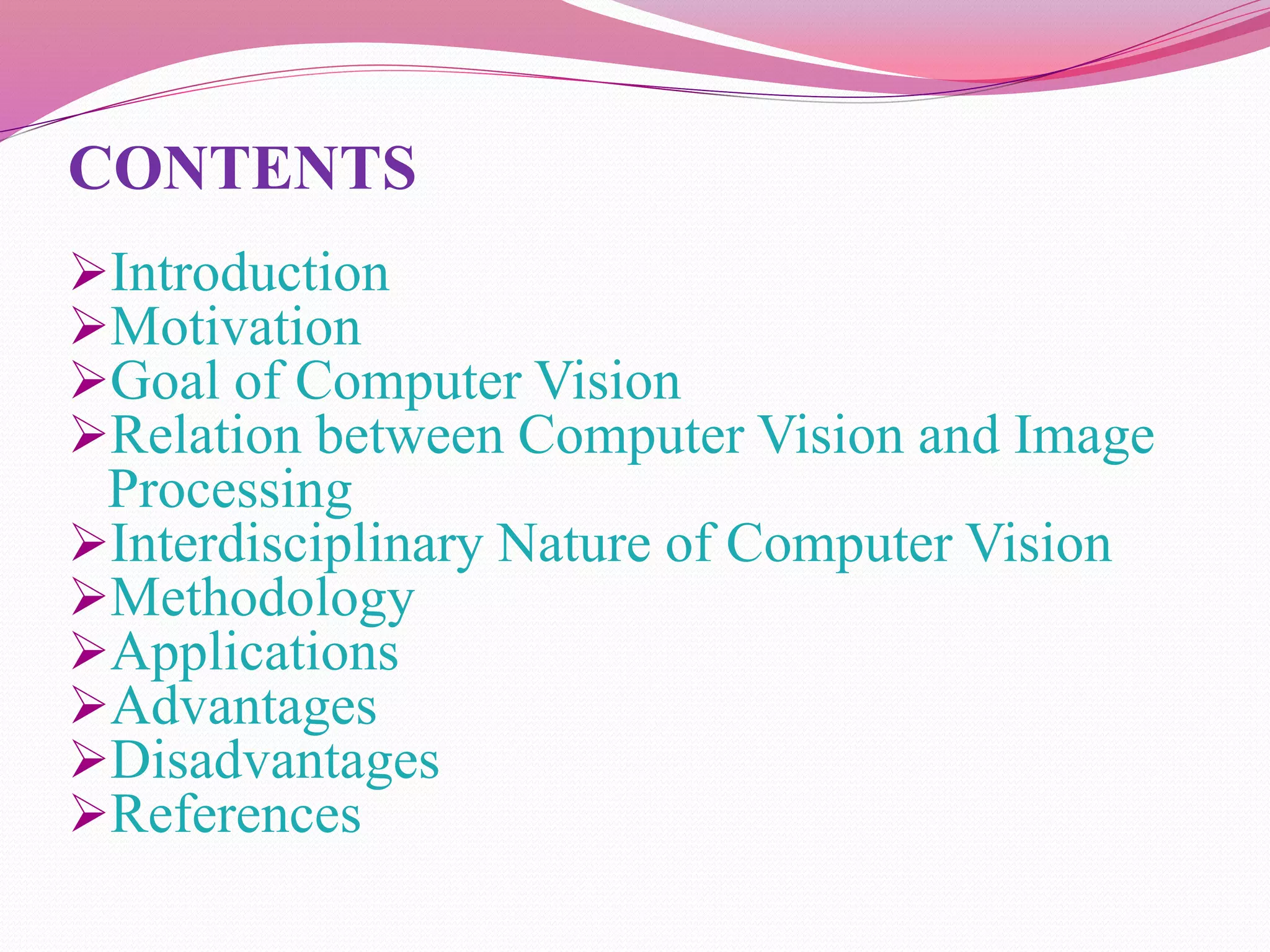Computer vision is the automation of human visual perception to allow computers to analyze and understand digital images. The goal is to emulate the human visual system through techniques like deep learning. Computer vision involves image acquisition, processing, and analysis to interpret images beyond just recording them. It has applications in areas like object detection, facial recognition, medical imaging, and self-driving cars. While it provides advantages like unique customer experiences, it also raises privacy concerns regarding how the data used is collected and stored.