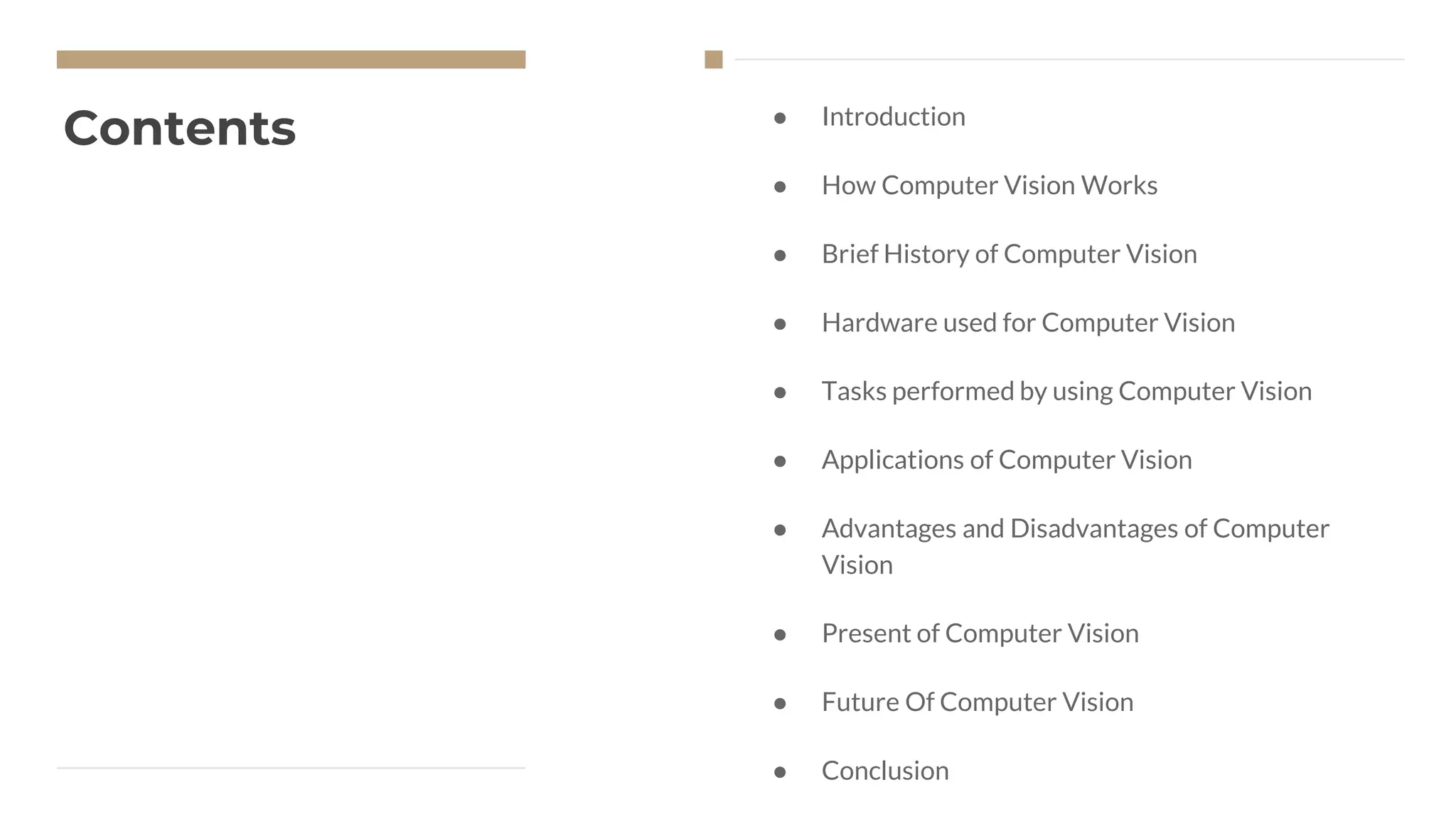 Computer vision analyzes visual data like images and videos to understand and interpret them similarly to humans. It works by training models on large datasets to recognize patterns and classify objects. Applications include face recognition for login, medical imaging analysis, and computer vision in autonomous vehicles. The future of computer vision may involve combining it with natural language processing for image captioning and visual assistance applications.