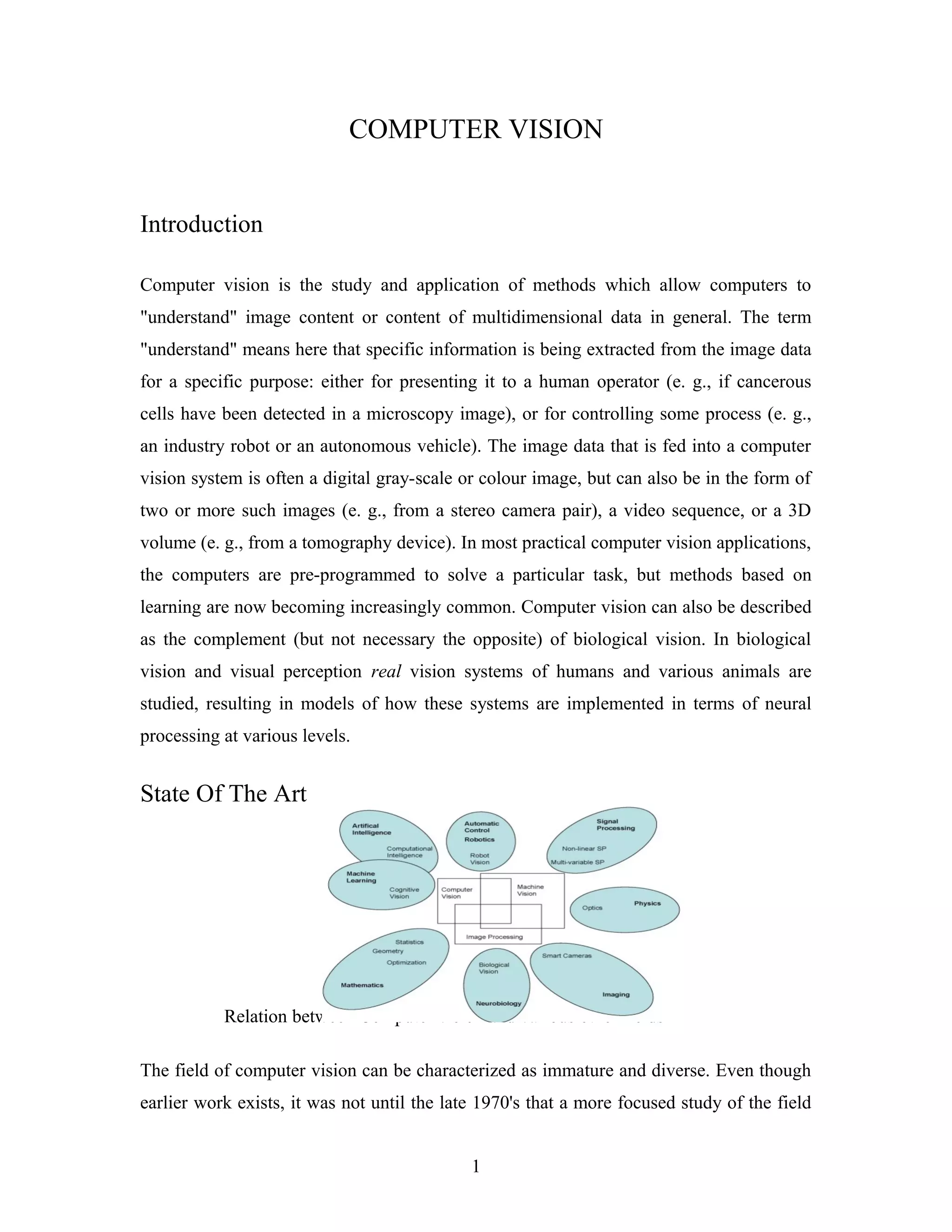 Computer vision is the study and application of methods that allow computers to understand image content. The goal is to extract specific information from images for human or automated use, such as detecting cancerous cells or controlling an industrial robot. Computer vision relies on digital images as input and can involve single images, multiple images, videos, or 3D volumes. While early systems were programmed for specific tasks, machine learning is increasingly used. Computer vision draws from fields like artificial intelligence, signal processing, neurobiology, and mathematics. It involves tasks like recognition, motion analysis, and scene reconstruction. Typical computer vision systems include image acquisition, preprocessing, feature extraction, and registration. Applications include facial recognition, mobile robots, and more.