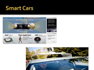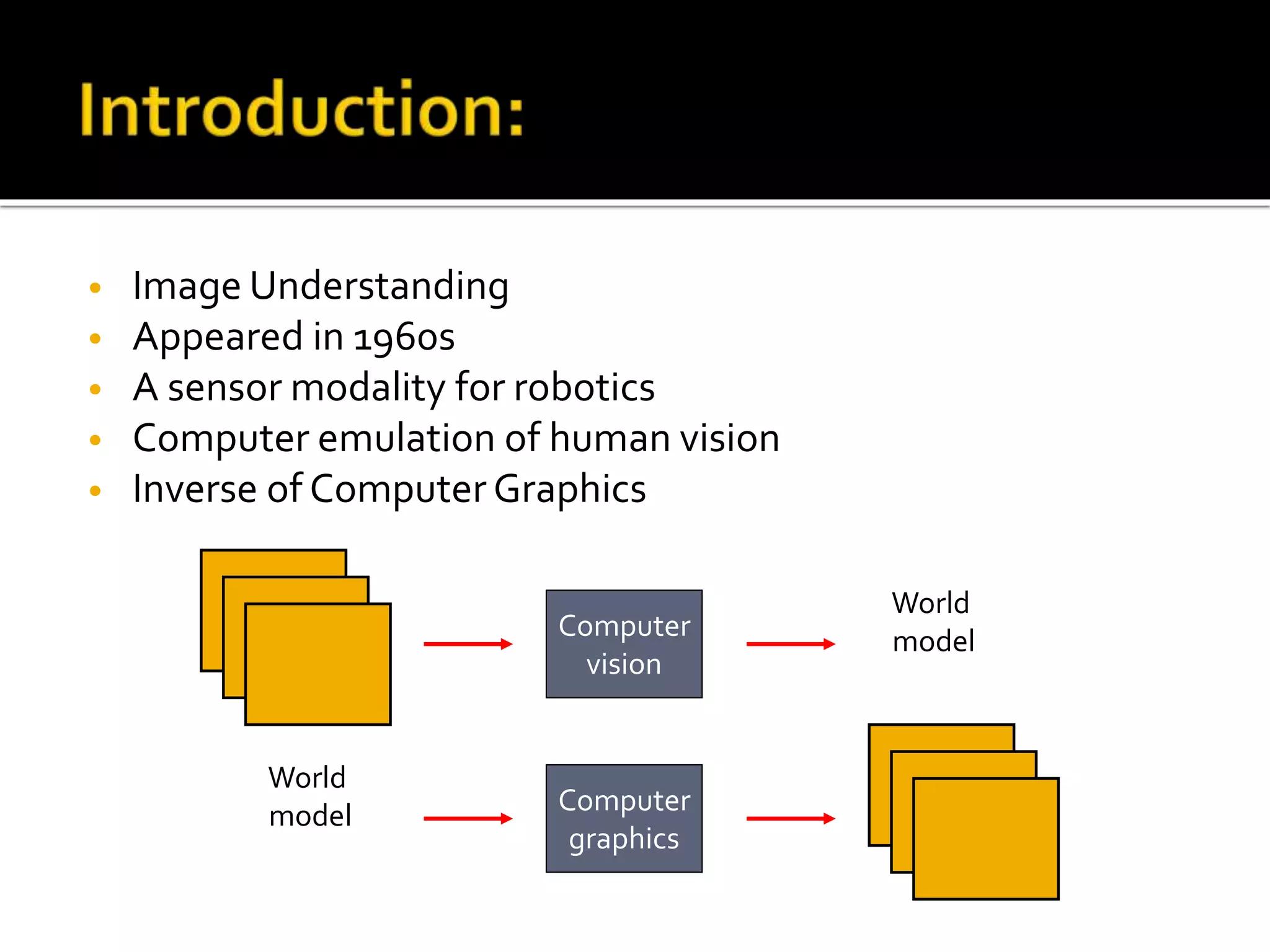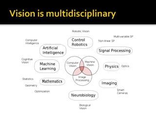 Computer vision is the goal of writing programs that can interpret images, such as video sequences or medical scans. It involves acquiring images, preprocessing them, extracting features, detecting/segmenting objects, and recognizing/interpreting the images. Computer vision draws from fields like calculus, linear algebra, and statistics. It has applications in areas like robotics, navigation, inspection, and medical imaging. While computer vision has improved, it still lacks the subtlety and versatility of human vision.