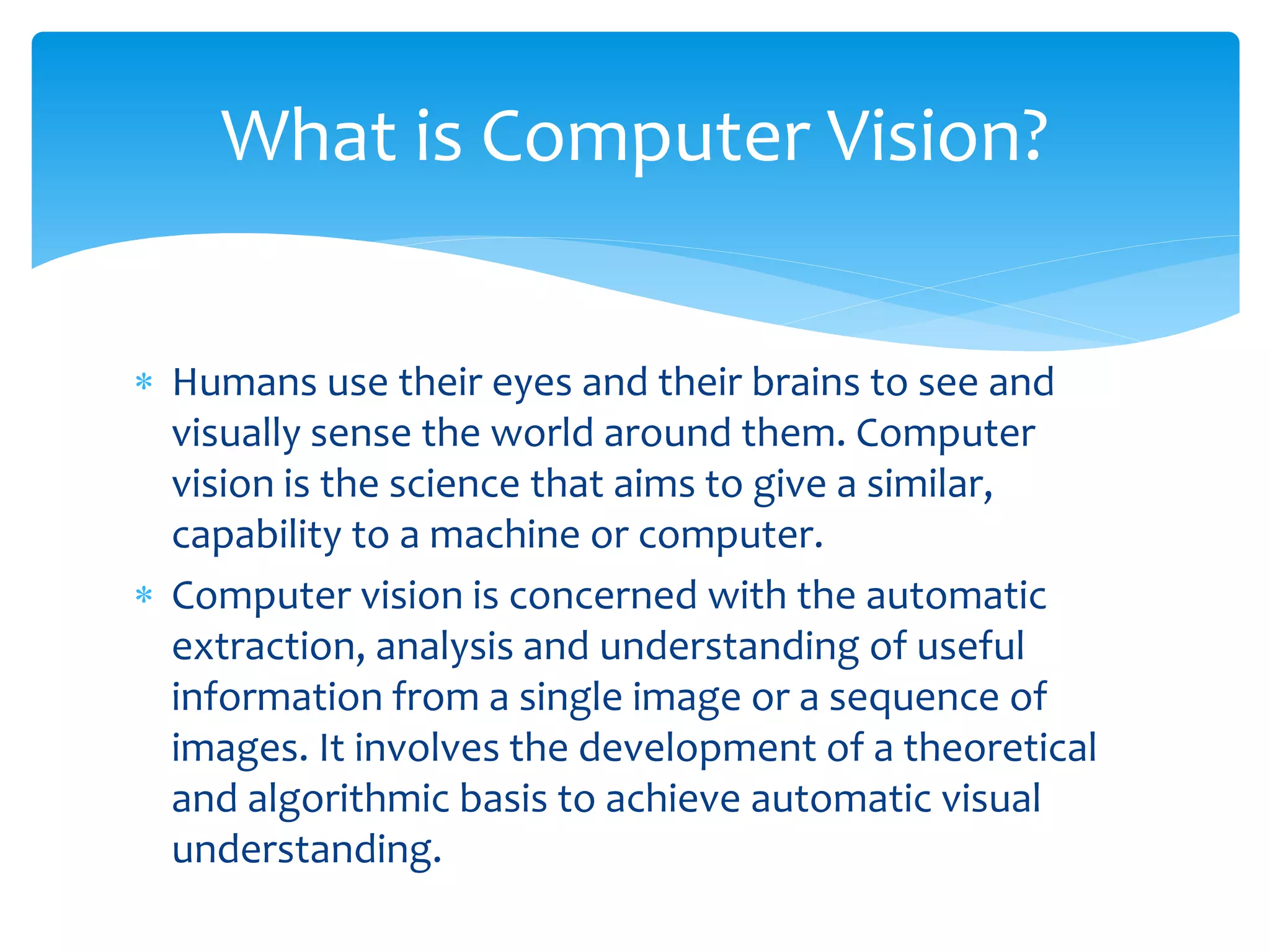 The document discusses computer vision, which aims to give machines human-like visual capabilities. It defines computer vision as using computers to gain understanding from images or videos. The key tasks of computer vision are acquiring, processing, analyzing and understanding digital images to extract information. Examples of applications discussed include industrial machine inspection, autonomous vehicles, visual surveillance, and more. The document also provides a brief history of the field and discusses some incremental software development models like incremental, RAD, and spiral models.