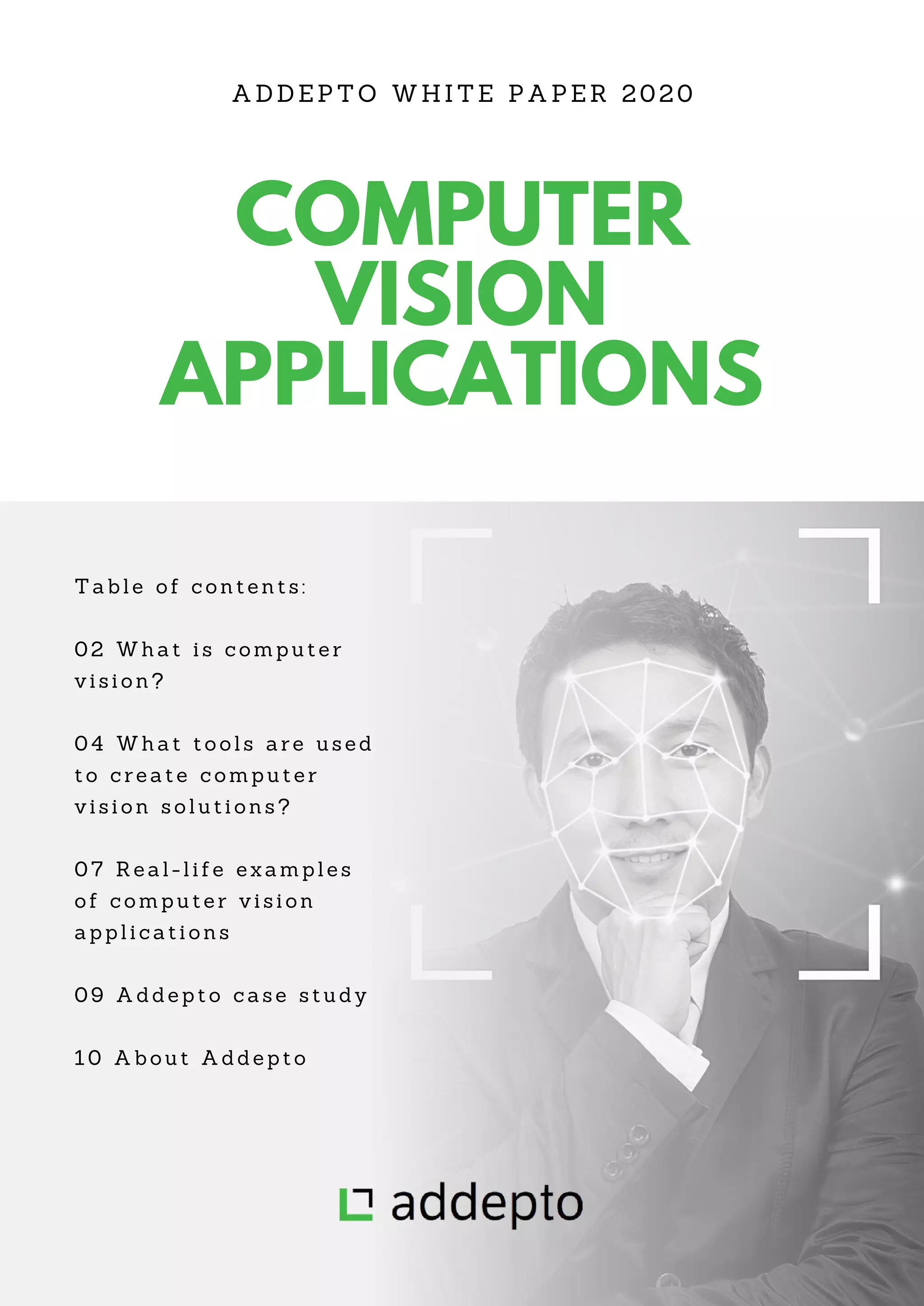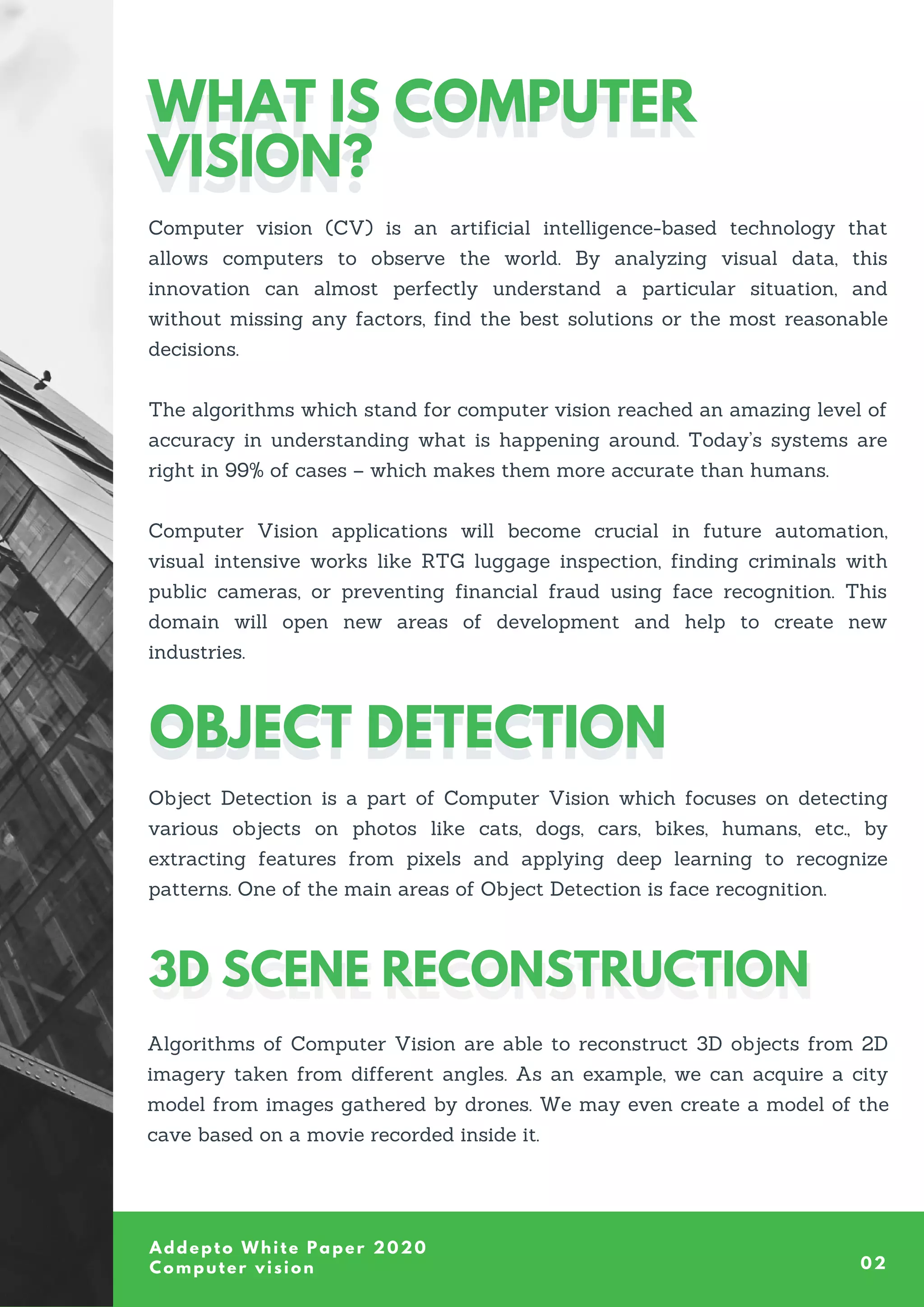The document provides an overview of computer vision (CV), detailing its definition, tools, applications, and a case study by Addepto. CV utilizes AI to interpret visual data with high accuracy, enabling automation in various sectors like security, retail, and industrial maintenance. Addepto's case study illustrates a successful application of CV technology in finding lost luggage at airports through deep learning models.
