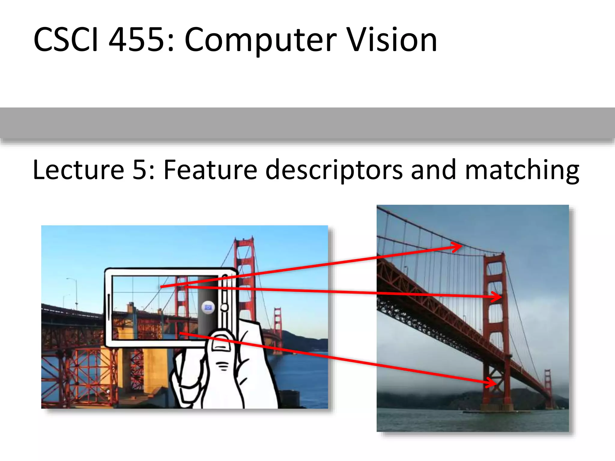This document discusses feature descriptors and matching in computer vision. It covers three main components: 1) detecting interest points in images, 2) extracting feature descriptors around each interest point, and 3) determining correspondences between descriptors to match features across images. The document focuses on SIFT (Scale Invariant Feature Transform) descriptors, which are histograms of gradient orientations computed over localized patches that provide robust matching across changes in scale, rotation and illumination. SIFT descriptors have been widely and successfully used for applications like image stitching, 3D reconstruction, object recognition and augmented reality.