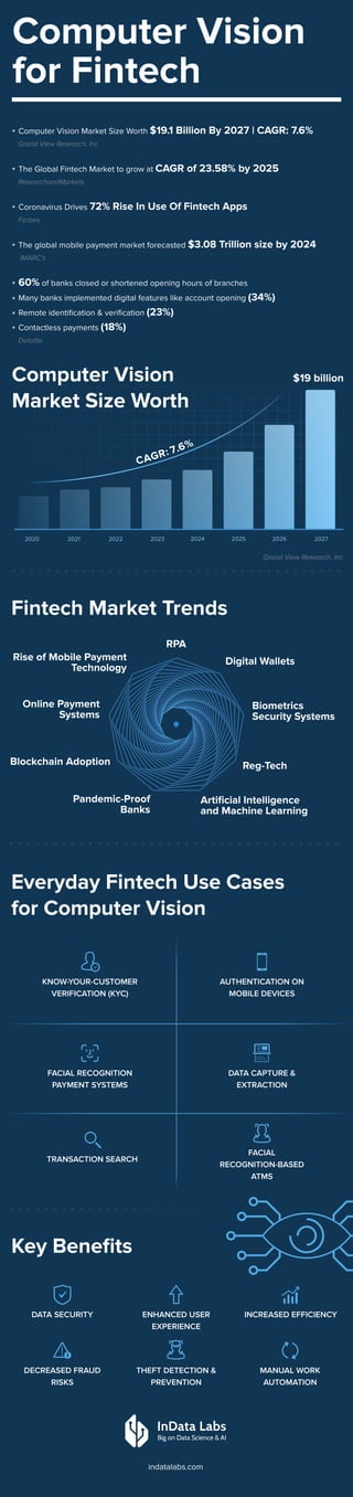 The global fintech market is projected to grow at a CAGR of 23.58% by 2025, with the computer vision market size anticipated to reach $19.1 billion by 2027. The pandemic has accelerated the adoption of fintech apps, resulting in a 72% increase in usage, alongside innovations in digital banking features such as remote identification and contactless payments. Key applications of computer vision in fintech include facial recognition and KYC verification, enhancing security and user experience.