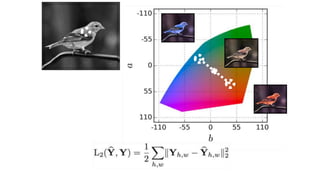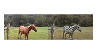 This document discusses using generative adversarial networks (GANs) to synthesize images. GANs involve training a generator network to produce synthetic images and a discriminator network to distinguish real images from synthetic ones. The goal is for the generator to learn to produce highly realistic images that fool the discriminator. The document outlines several applications of GANs like image colorization, super resolution, image-to-image translation (e.g. labels to street views). It explains how GANs can help with challenges in computer vision like high-dimensional, structured outputs and lack of supervised training data by having the discriminator assess image plausibility rather than correctness.