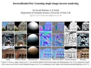 The document discusses the computer vision technique of photometric stereo, which uses images of an object lit by known light sources from different directions to determine the object's 3D shape and surface reflectance properties. It explains that photometric stereo solves a matrix equation per pixel to determine each pixel's surface normal from image intensities under different lighting. Integrating the surface normals can then yield a depth map. The technique works best for diffuse objects and makes assumptions such as constant albedo that may not always hold for real-world scenes.