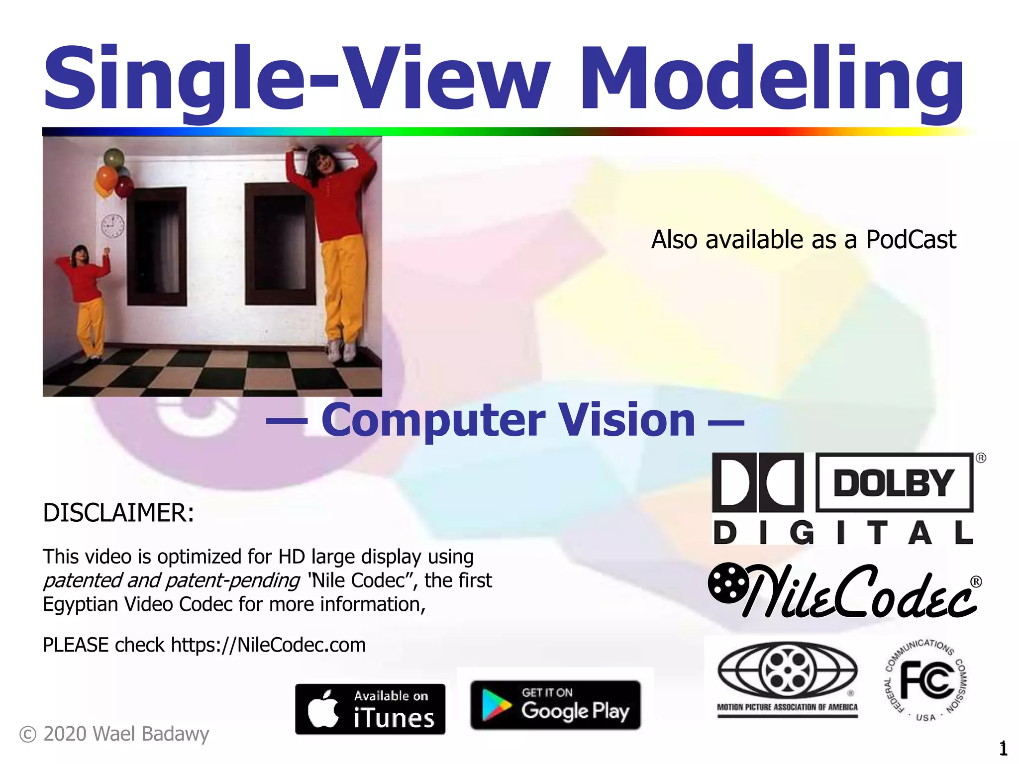 This document contains a video lecture on single-view modeling using computer vision and projective geometry techniques. It includes introductory information, copyright notices, and disclaimers. The content covers topics like vanishing points, lines, and perspectives; projective geometry principles; measuring distances in images; 3D reconstruction from photographs; and camera calibration. Sample applications demonstrated include estimating heights and modeling 3D scenes from 2D images.