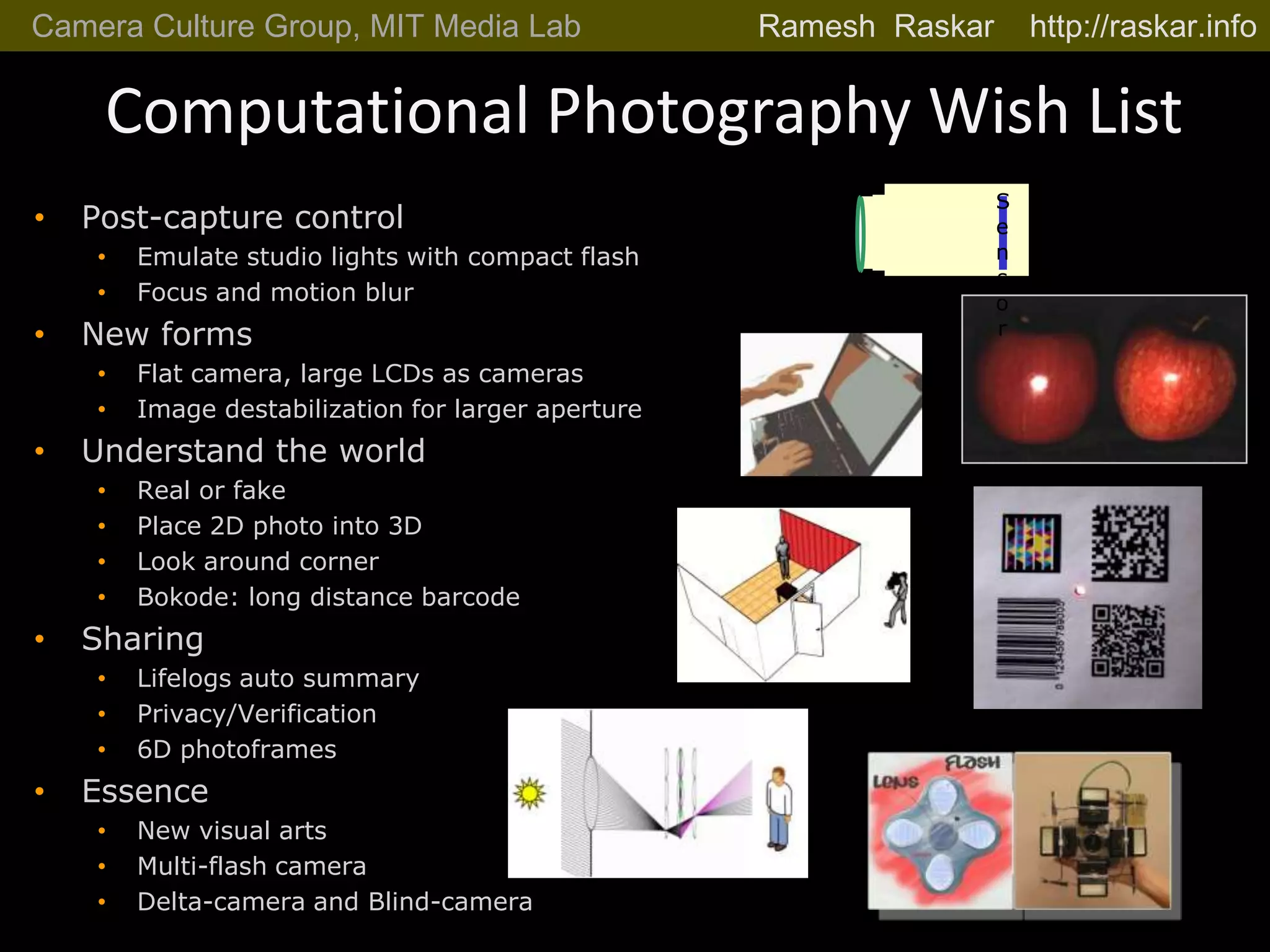 Ramesh Raskar presents his vision for computational photography and discusses several open research problems. He envisions cameras that provide ultimate post-capture control over focus and motion blur. He also discusses capturing the essence of a scene through techniques like multi-flash photography. Raskar outlines a wish list that includes understanding the world through analyzing photos, sharing visual experiences while preserving privacy, and looking around corners using techniques like transient imaging. The talk promotes co-designing optics and digital processing to change the rules of photography.
