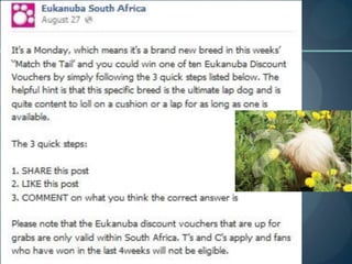 2. Create engaging content like questions, tips, videos and pictures that provide value for customers rather than just selling. Educational content should make up about 60% of posts.