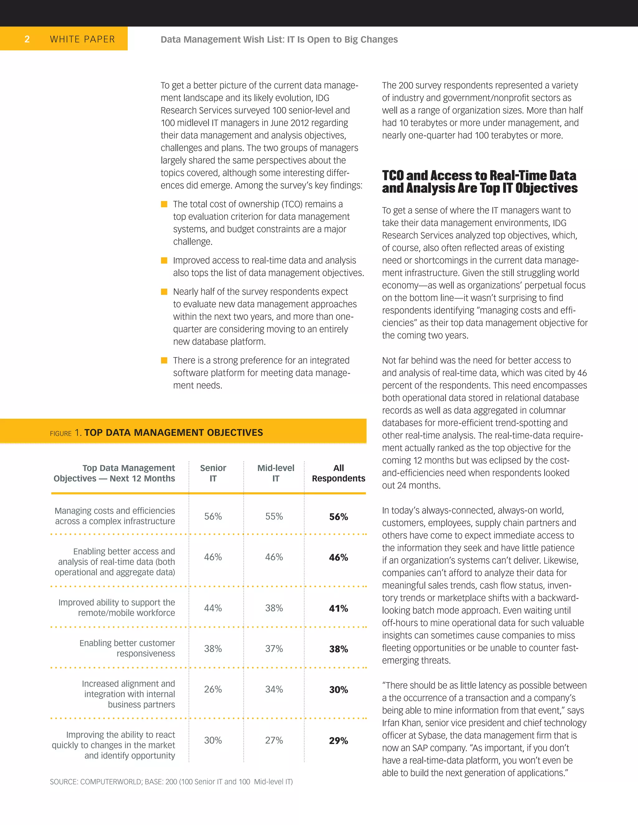 The document discusses a white paper on data management and its growing significance in the business landscape, highlighting challenges like data accessibility, cost management, and real-time analysis. Survey results indicate that both senior and mid-level IT managers prioritize improved access to real-time data and managing costs, while there is a strong interest in considering new data management solutions within the next two years. Additionally, the paper reflects a gap between current infrastructure effectiveness and the evolving requirements for real-time capabilities and integration, suggesting that many organizations are reevaluating their data management strategies.