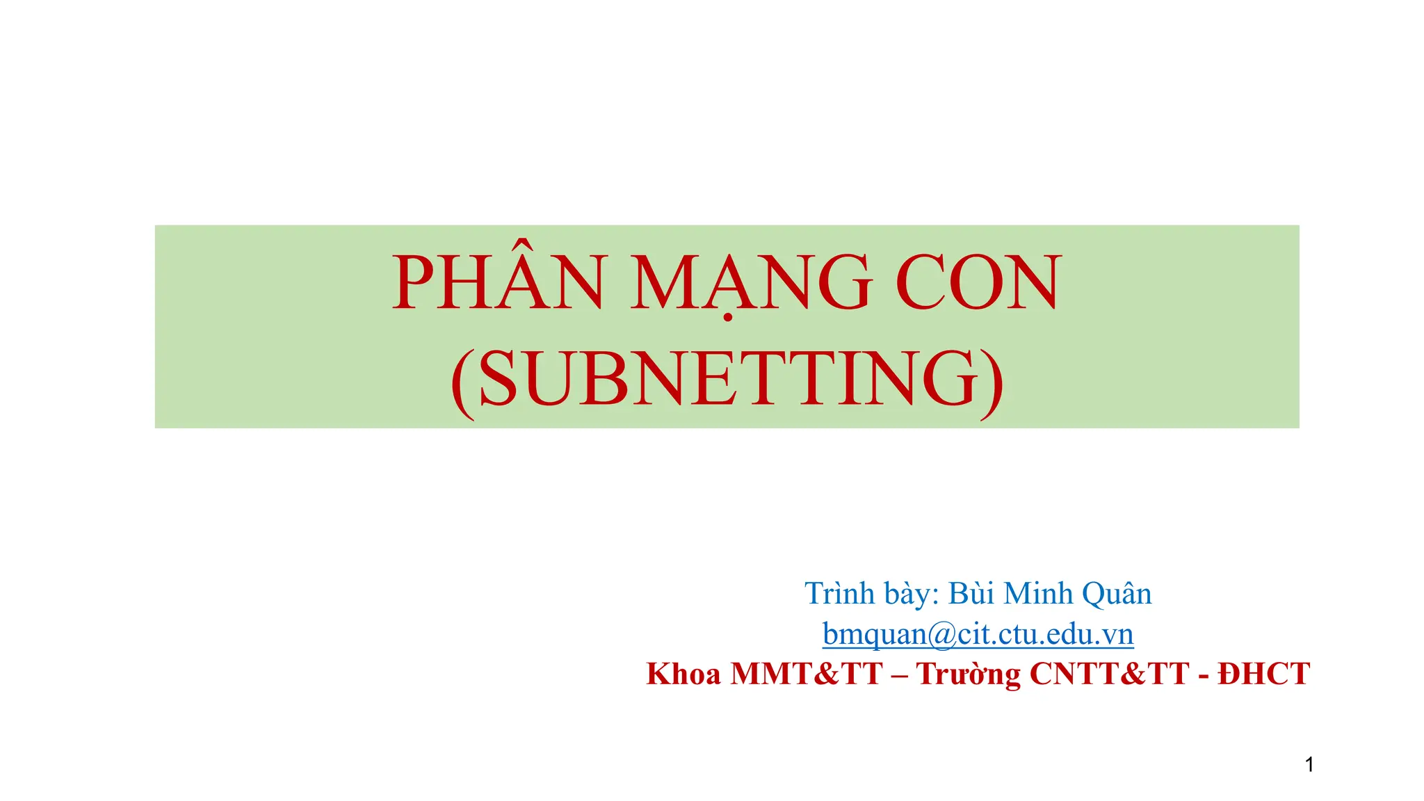 Phân mạng con (subnetting) là kỹ thuật chia mạng lớn thành các mạng nhỏ hơn để quản lý dễ dàng hơn, tăng cường bảo mật và giảm thiểu lưu lượng quảng bá. Nó yêu cầu xác định mặt nạ mạng con, giữ nguyên phần nhận dạng mạng chính và phân chia phần nhận dạng máy tính thành các phần cho mạng con và máy tính trong mạng con. Hai chuẩn phổ biến cho phân mạng con là chuẩn phân lớp hoàn toàn (classfull) và chuẩn định tuyến không phân lớp (CIDR).